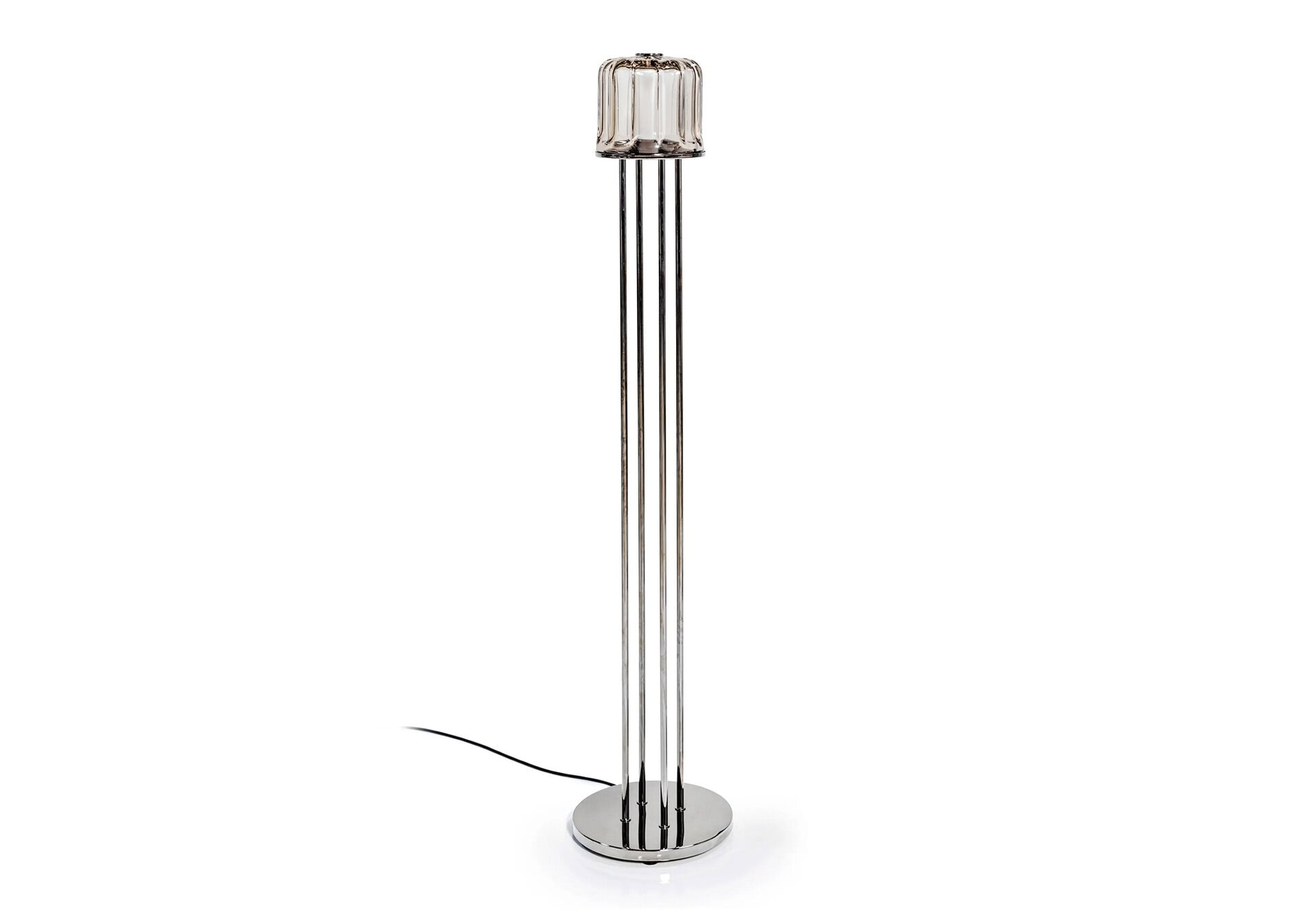 Echoing the lines of the Acacia side table, the lamp is both sculptural and understated. A tubular black chrome frame rises from the base to elevate its glass form: a scalloped, mouth-blown Murano fumé-clear shade that diffuses light with subtle radiance.
