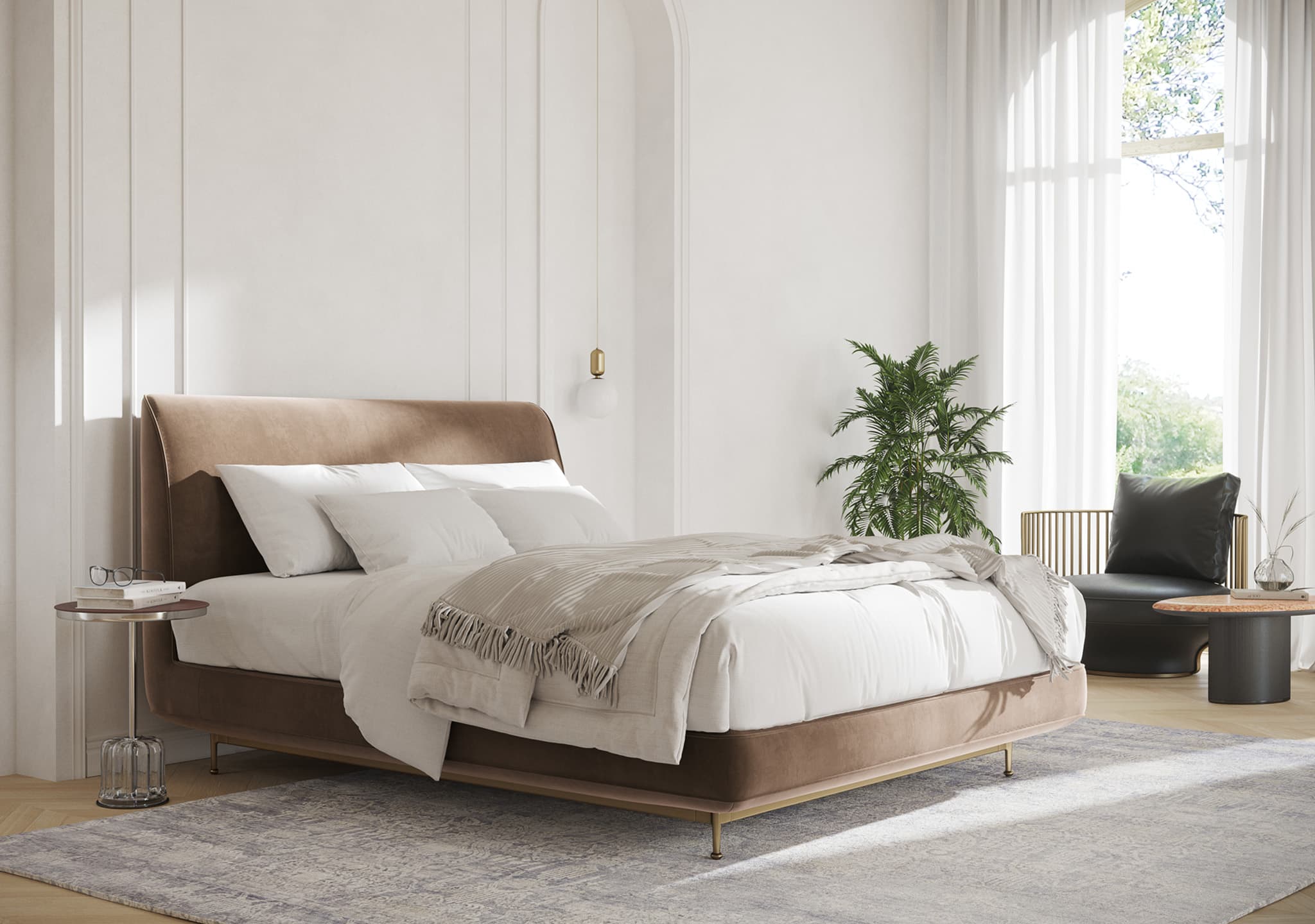 Appearing as a serene and plush oasis and seemingly afloat on a light, painted metal structure, the Andes bed is the embodiment of comfort and elegance. The double piping – an element inspired by Josef Hoffmann‘s Haus Koller chair – runs along the perimeter defining the piece’s organic form in a testament to handcrafted precision. The headboard and bed base cover is sewn from a single piece – a masterful manifestation of art that underpins the impression that everything is cast from one dye. A tribute to an ultimate night’s rest.