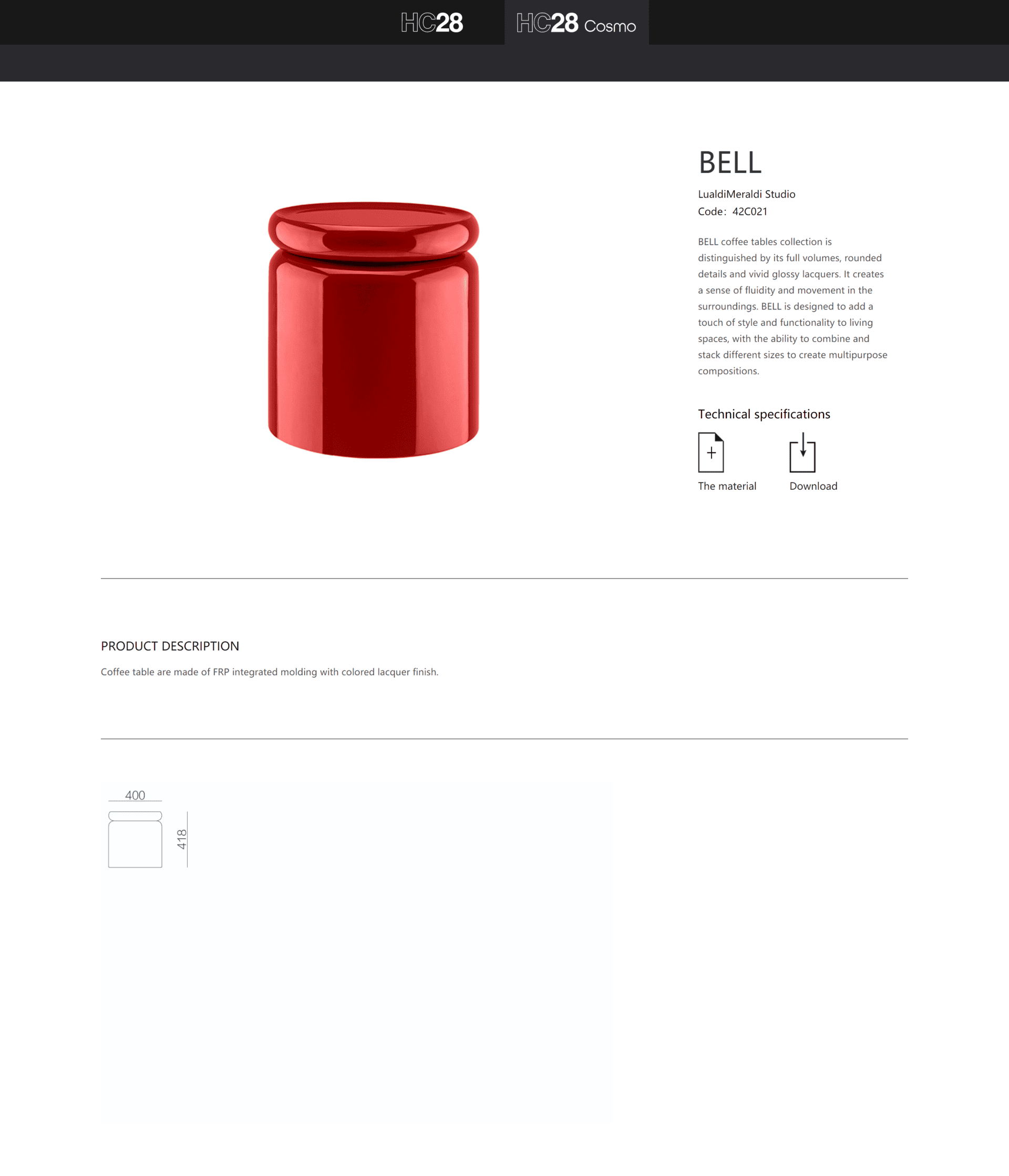 The drum-shaped Bell Side Table, by Lualdi Meraldi Studio for HC28 Cosmo, is distinguished by its sleek rounded shape. Plus, it is stackable!
