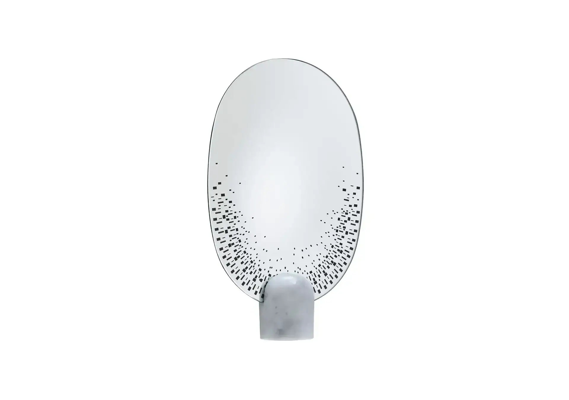The Confetti Mirror, designed by Constance Frapolli for Ligne Roset, is a sophisticated freestanding oval table mirror featuring a solid polished Carrara marble base for stability.