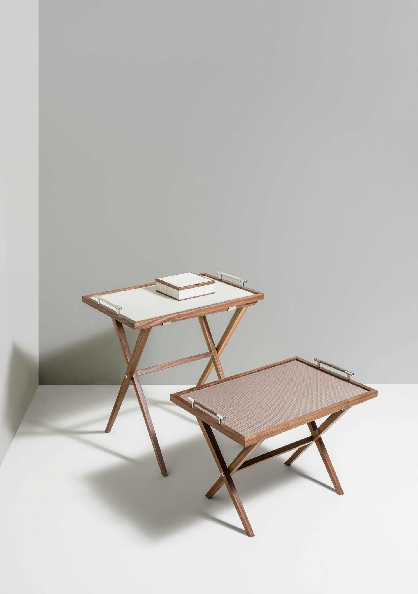 The foldable Dedalo Small Table by Pinetti combines space-saving convenience with a removable leather tray.