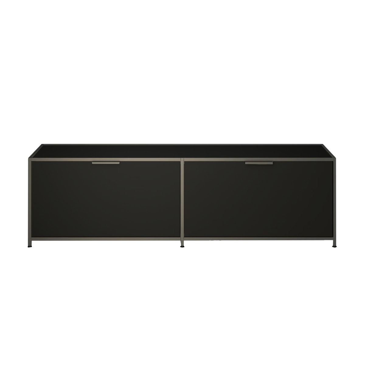 A modern entertainment console for contemporary interiors. Features an elegant anodised aluminium frame and wood panels, lacquered in a variety of colour options. Option of 2 drop down flap cupboards or drawer and flap cupboard combination open via slimline handles, concealing plenty of storage space for all the essentials.