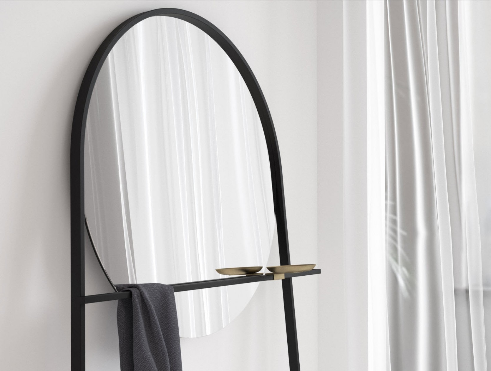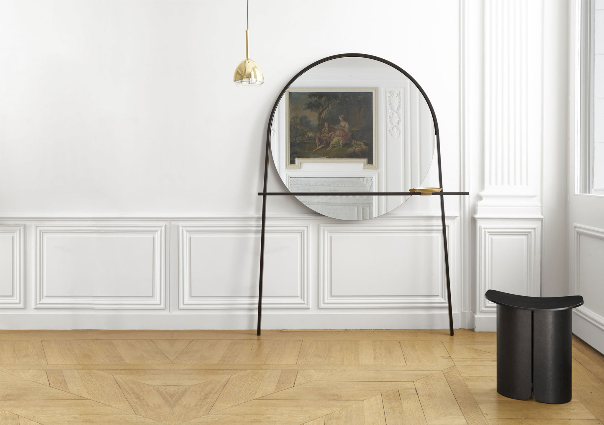 Its pared-down design makes it minimalist, yet its dimensions render it spectacular! The Geoffrey Mirror by Ligne Roset contrasts its masterful, virile black lacquered steel structure with the subtle delicacy of its small brass-coated steel trinket holder.