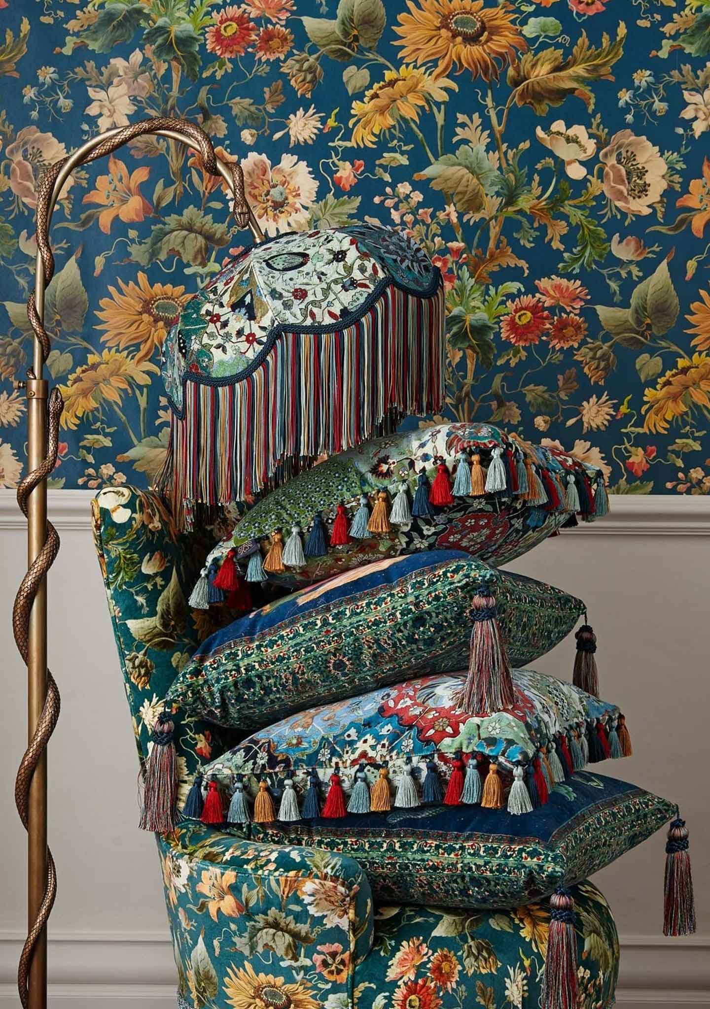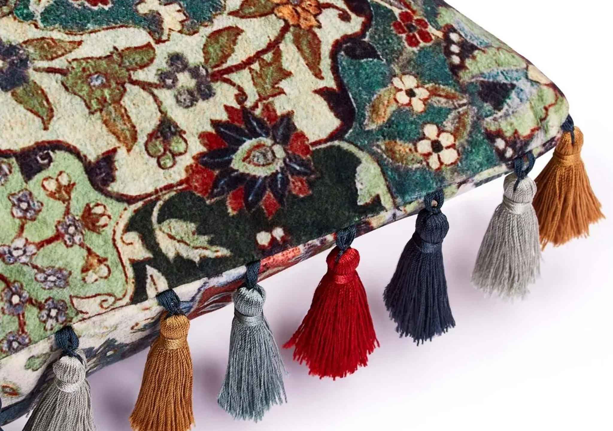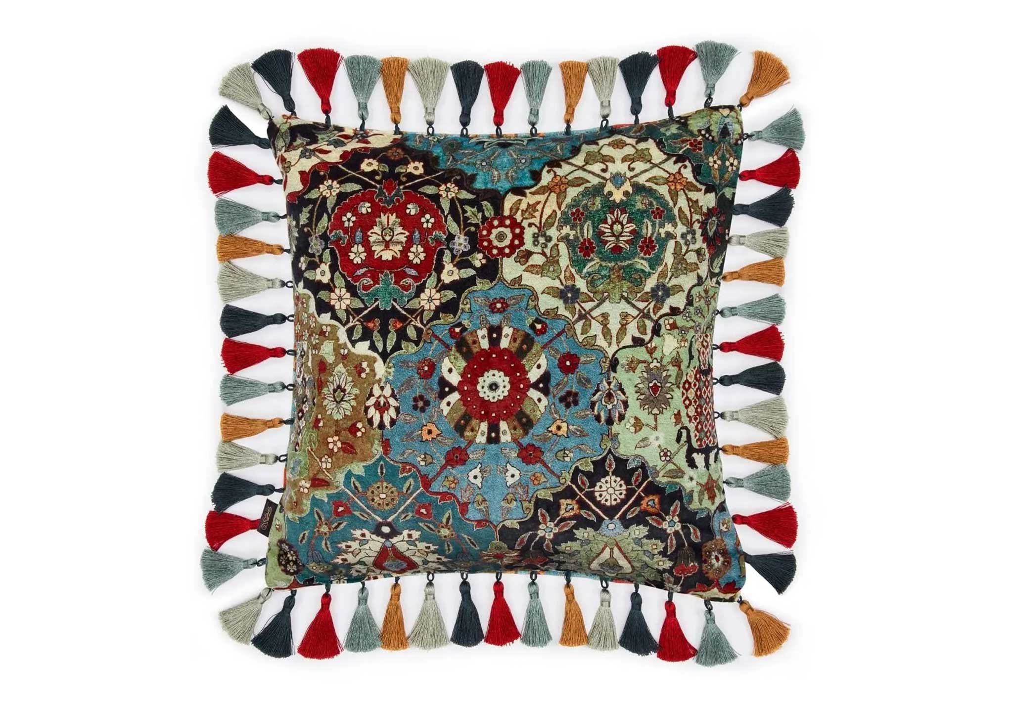 Combining intricate patterns with vibrant colour, the Caspar cushion is adorned with regal birds, flowers and antique vases. The cushion design is inspired by the original details of a handmade Tabriz carpet from Persia. Made in England, this eye-catching design is crafted from luxurious velvet with block-coloured tasselled fringing.