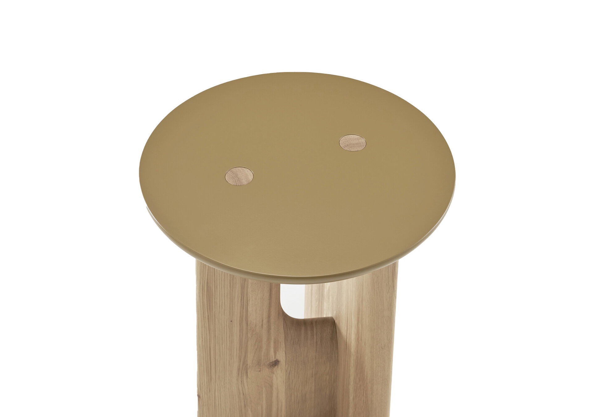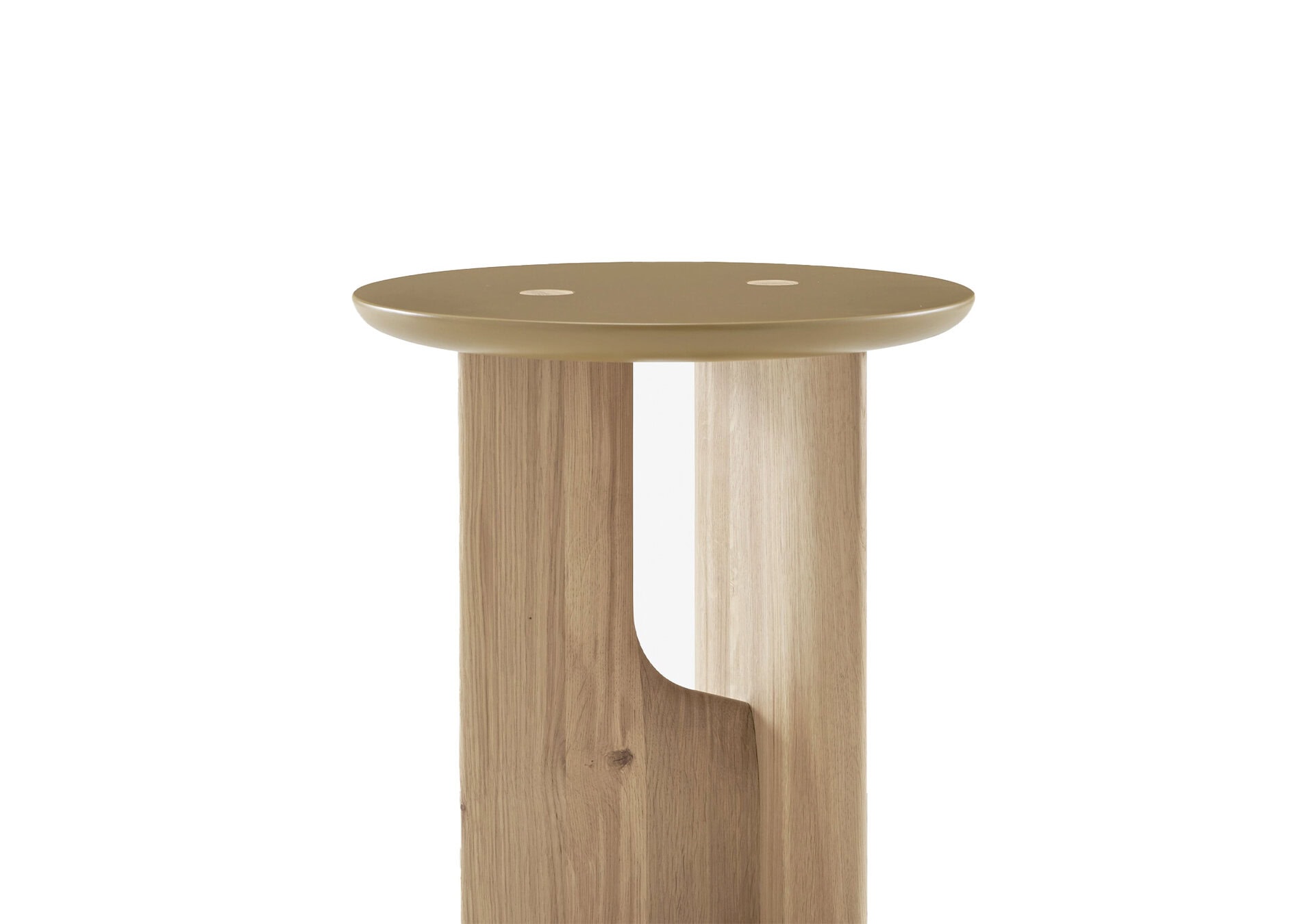 The vertical legs in solid whitened oak interconnect with a lacquered horizontal tabletop in the colour satin copper brown.