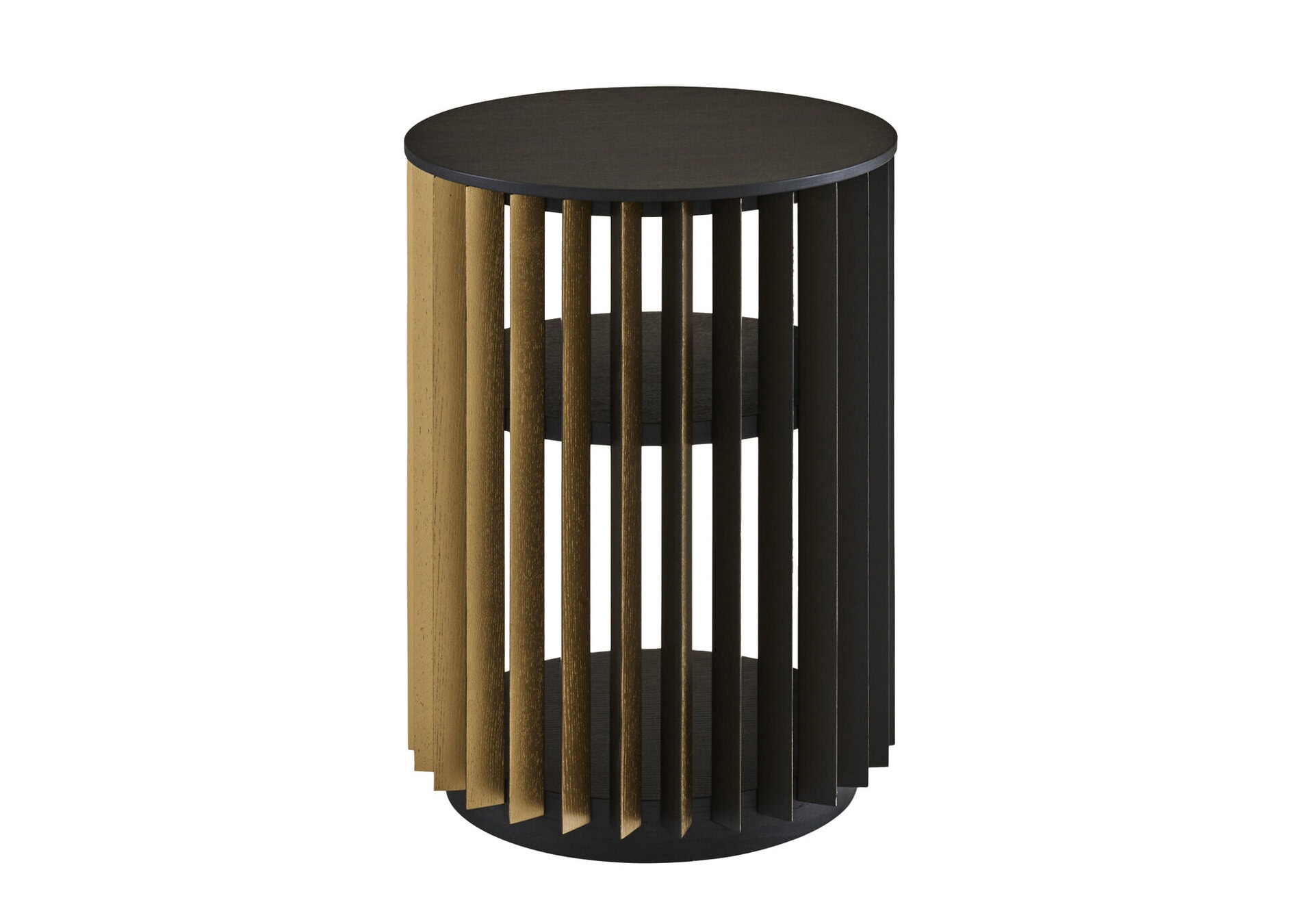 Crafted with a black stained ash veneer top, the table features triangular slats in a beautiful combination of bronze and black tinted ash. The tabletop is screwed in, offering the flexibility to replace it if needed.