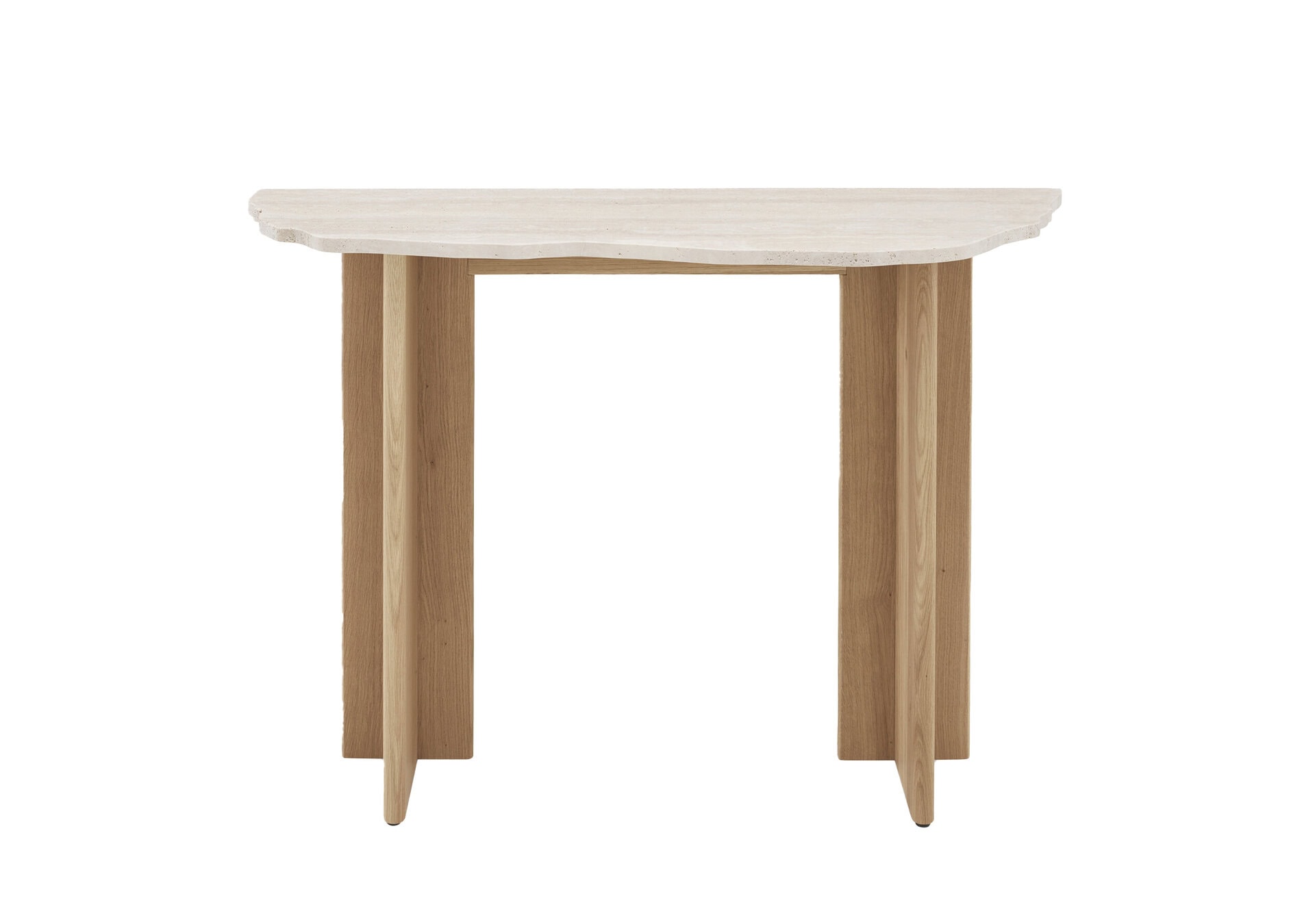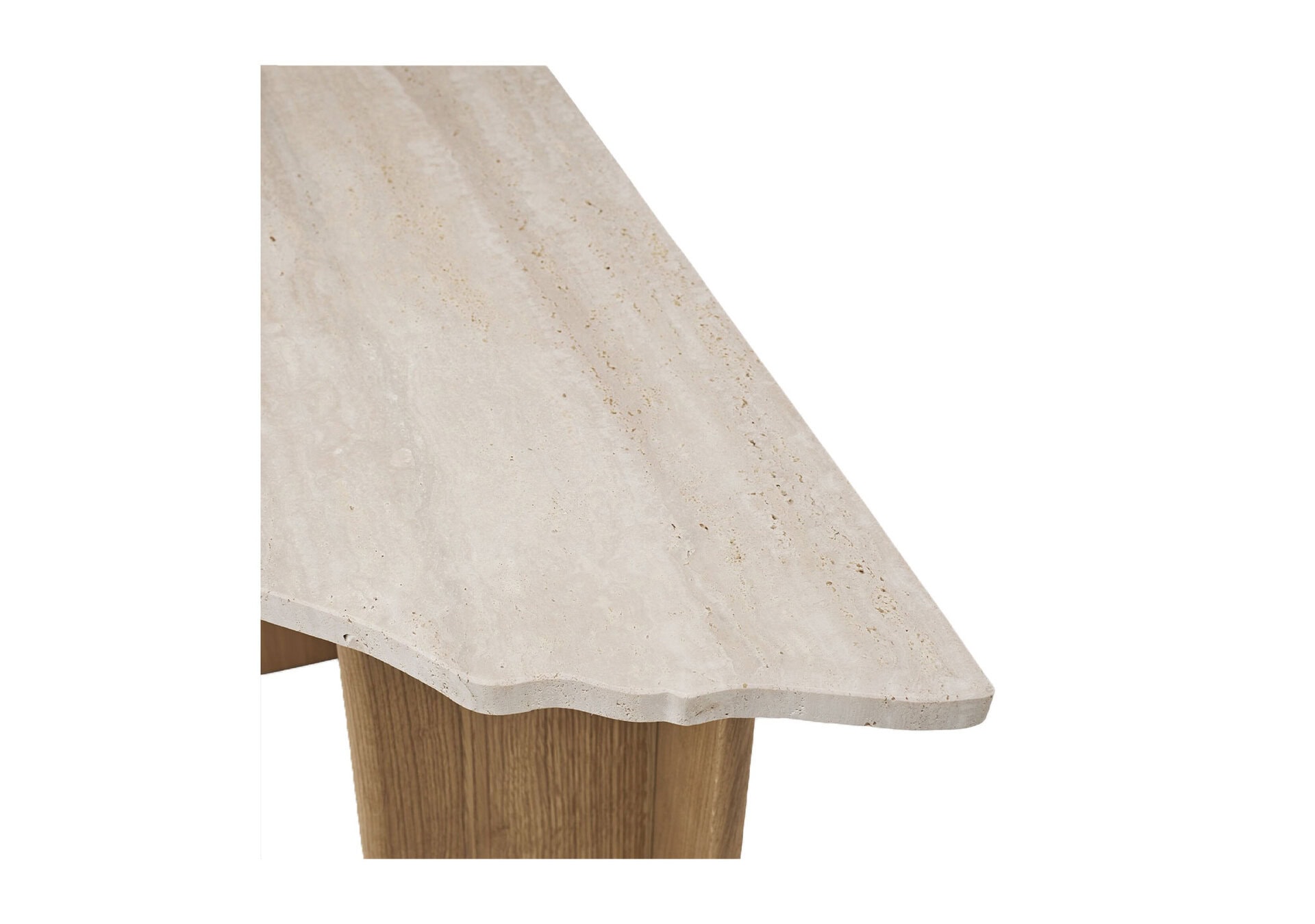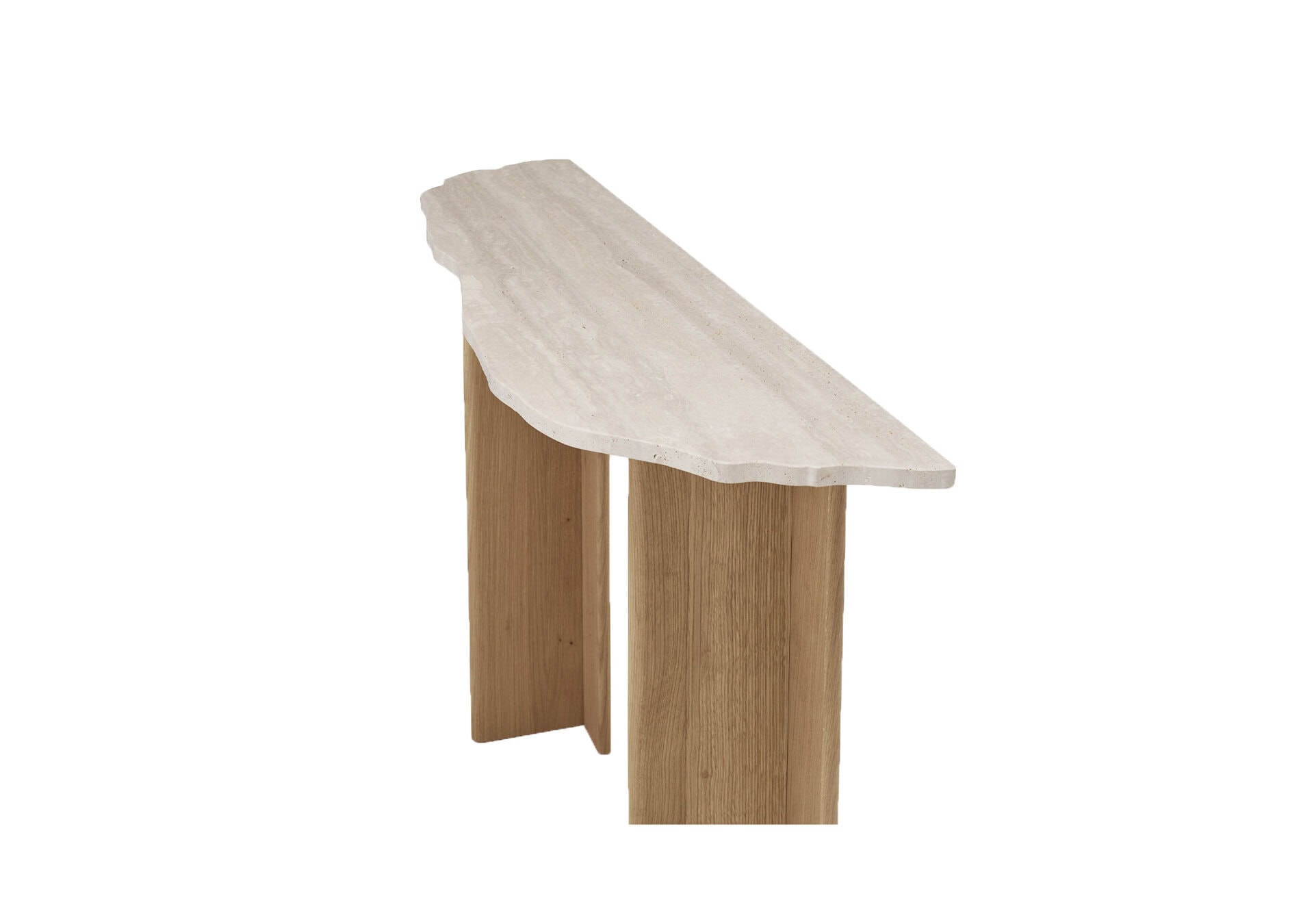The beautiful and functional sculpture combines only two materials: the travertine top and the solid wood base.