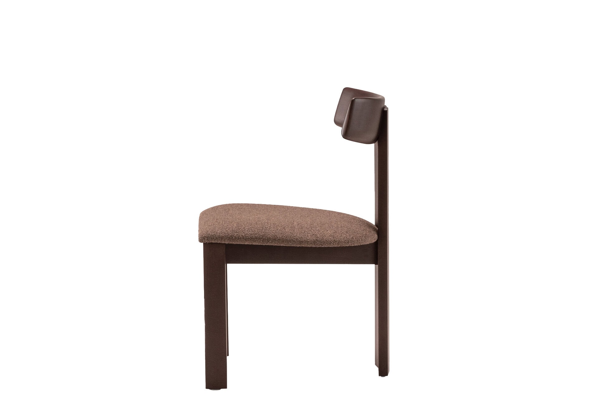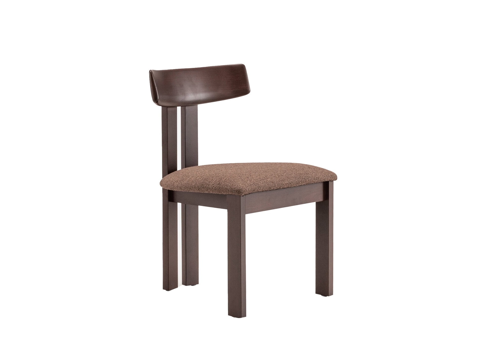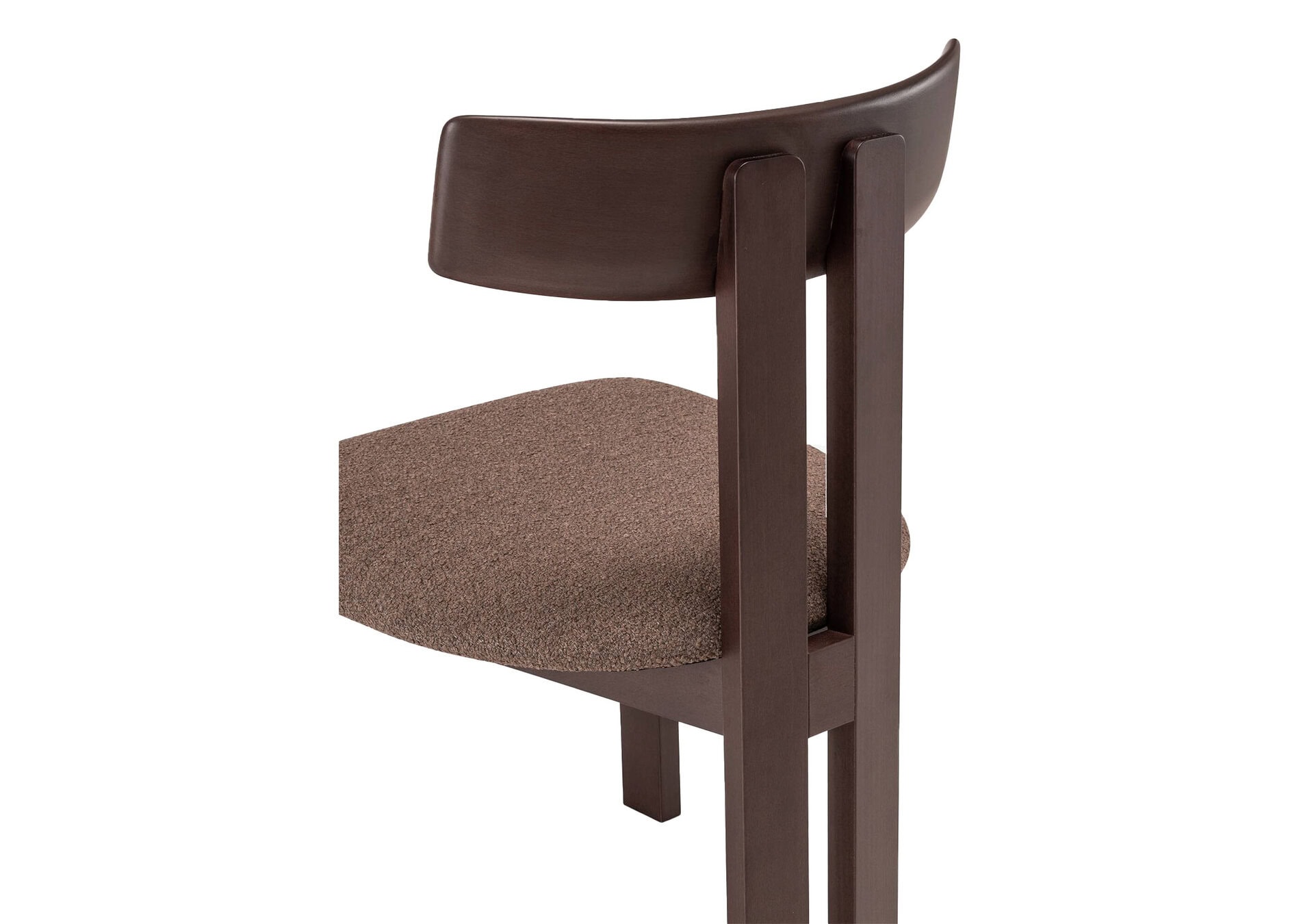 The design is distinguished by a preponderance of solid wood – walnut-stained to be precise. The backrest of the chair is rounded towards the inside. Behind which two vertical plank uprights provide a modern and warm aesthetic.
