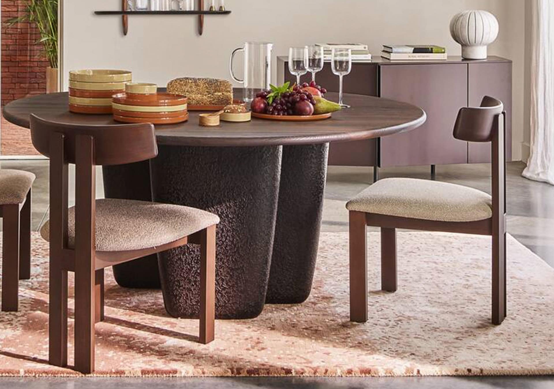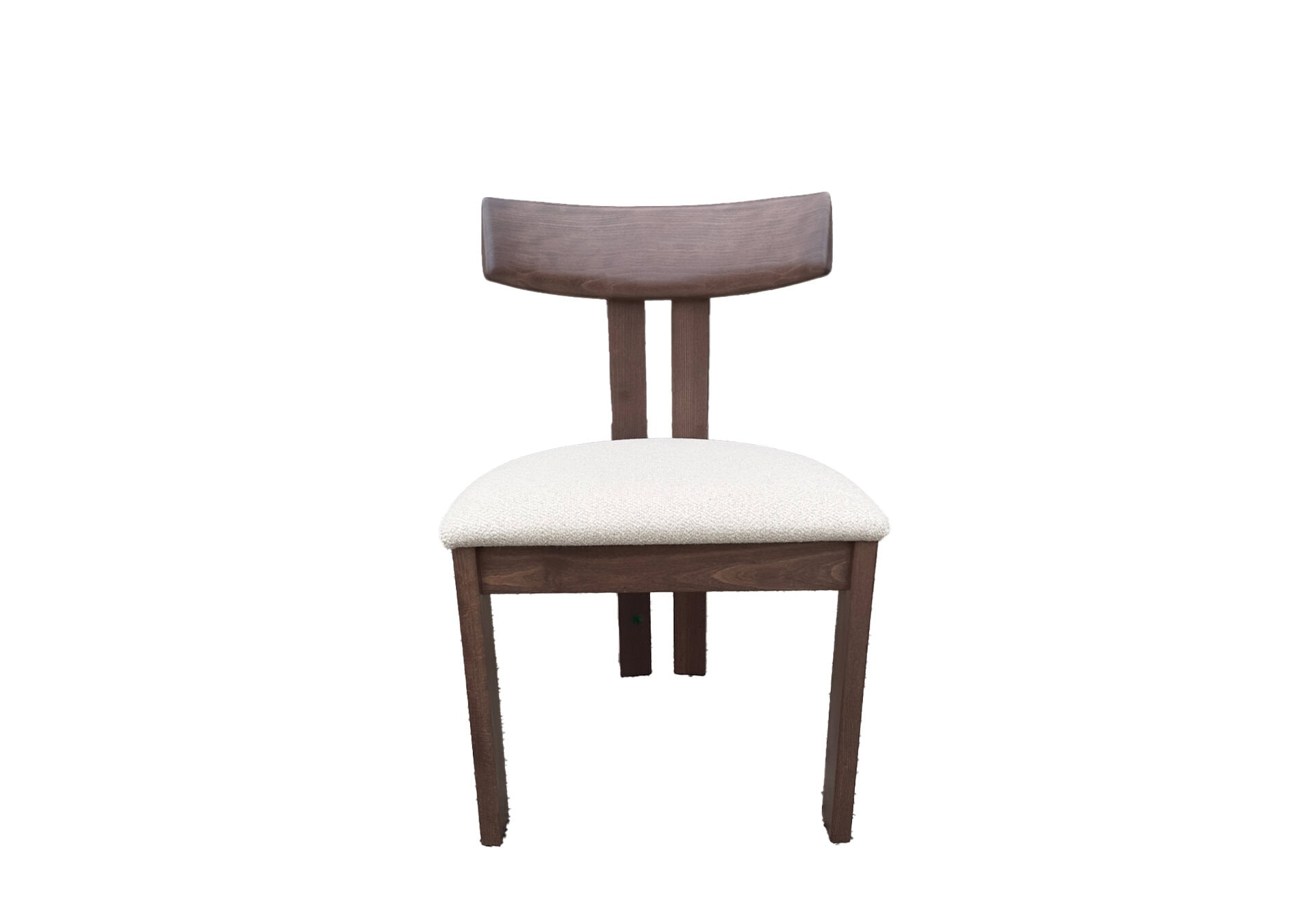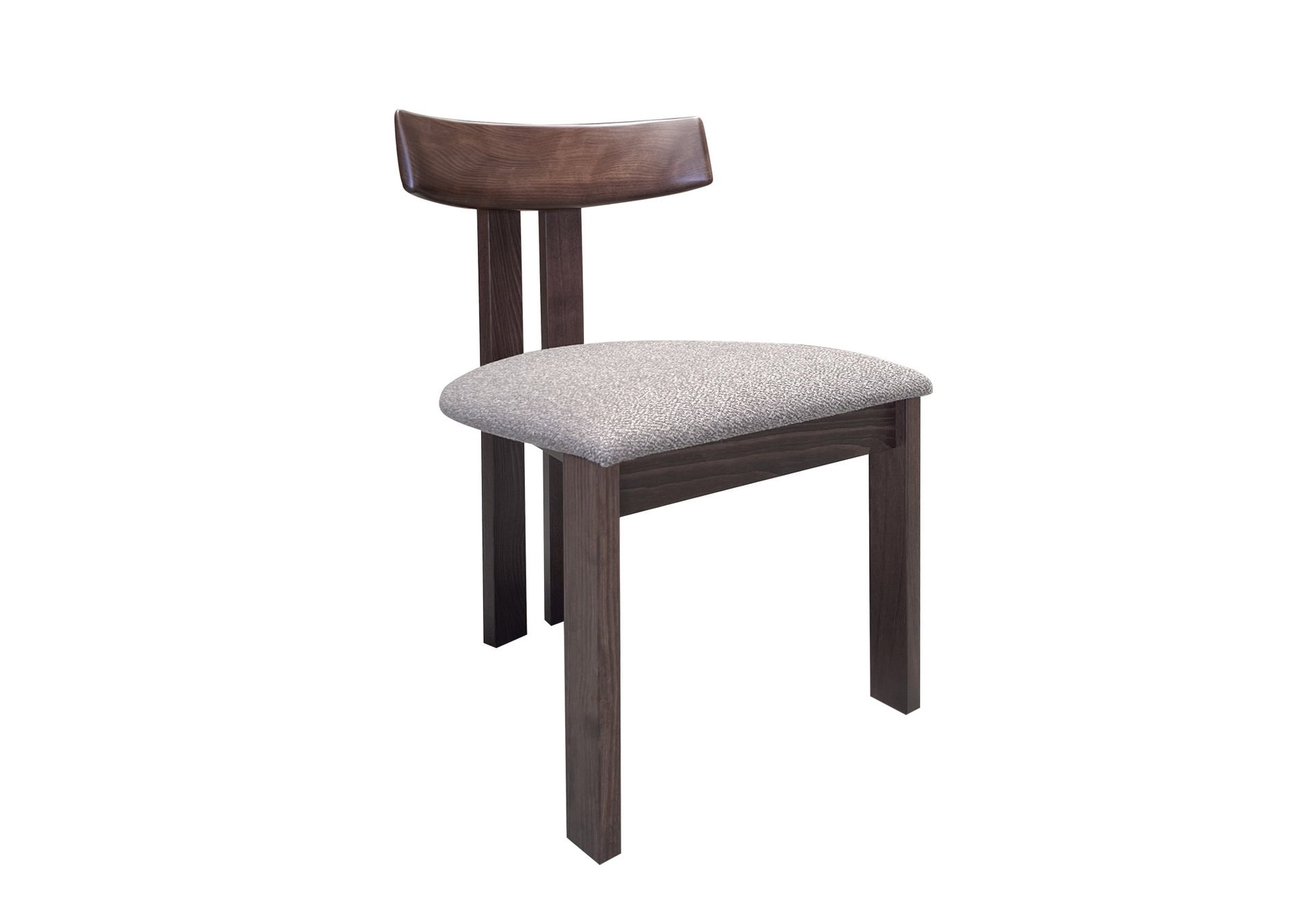 The design is distinguished by a preponderance of solid wood – walnut-stained to be precise. The backrest of the chair is rounded towards the inside. Behind which two vertical plank uprights provide a modern and warm aesthetic.