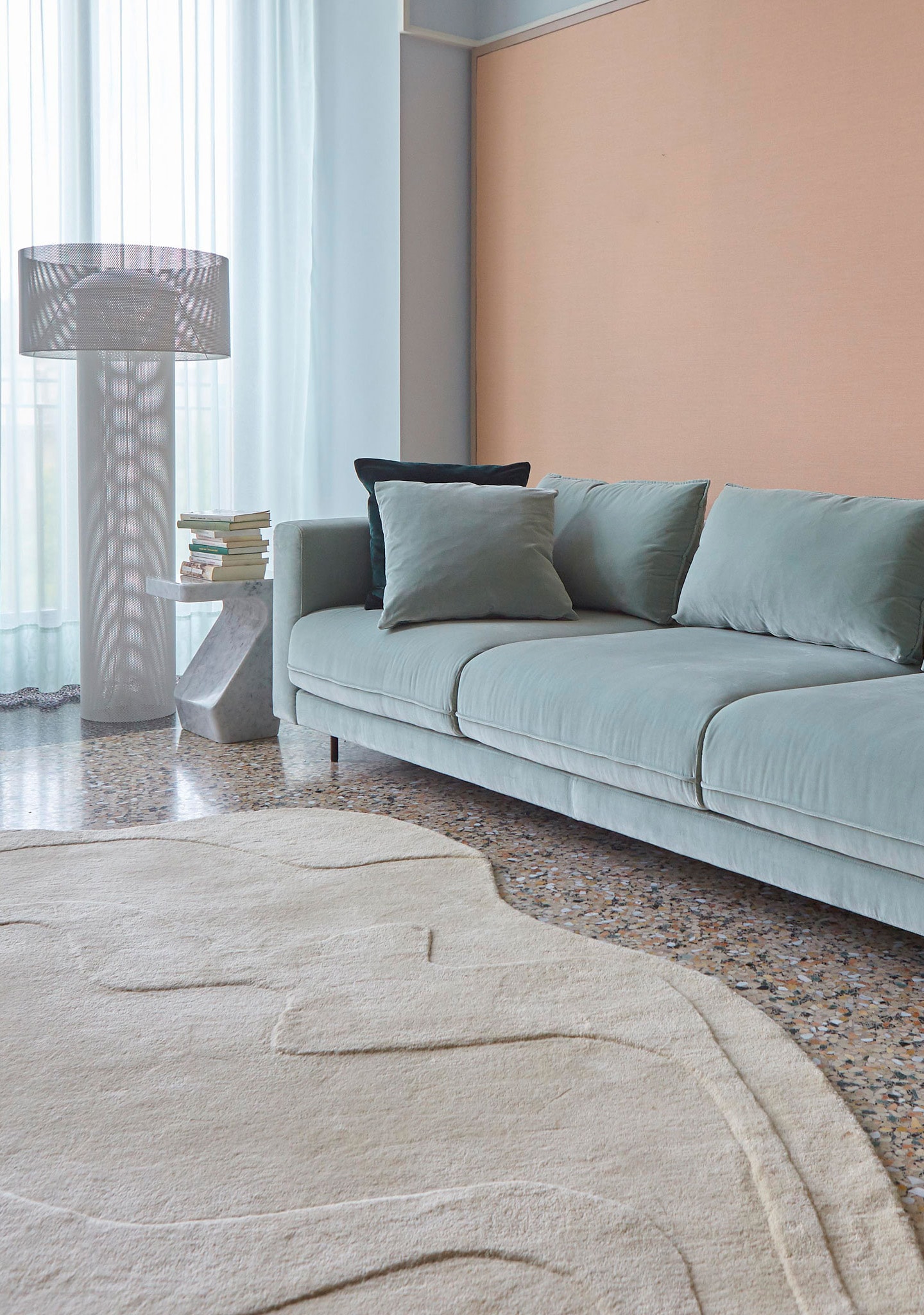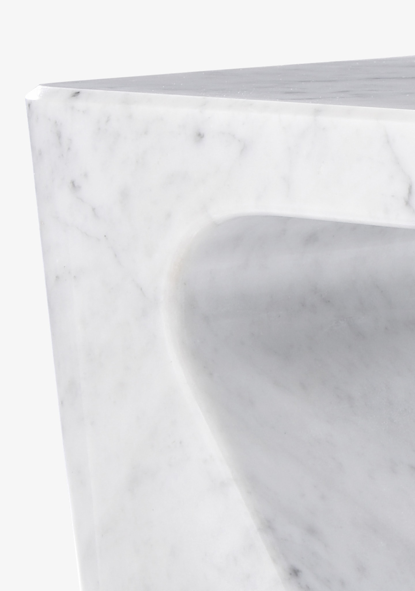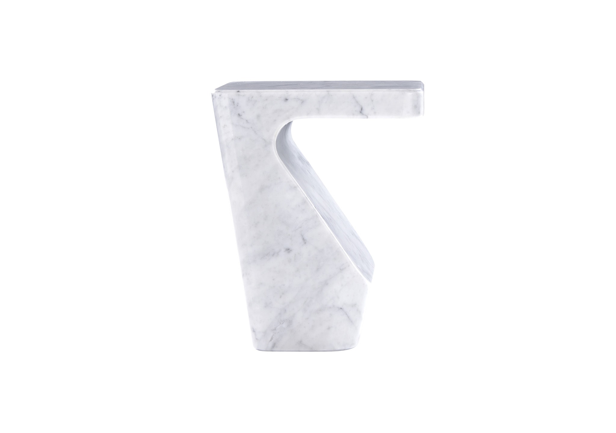 Occasional table in grey-veined white Carrara marble, hewn from one piece, polished then finished and protected with a water-repellent treatment.
