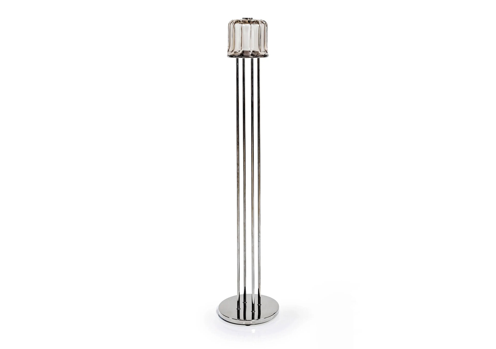 Echoing the lines of the Acacia side table, the lamp is both sculptural and understated. A tubular black chrome frame rises from the base to elevate its glass form: a scalloped, mouth-blown Murano fumé-clear shade that diffuses light with subtle radiance.