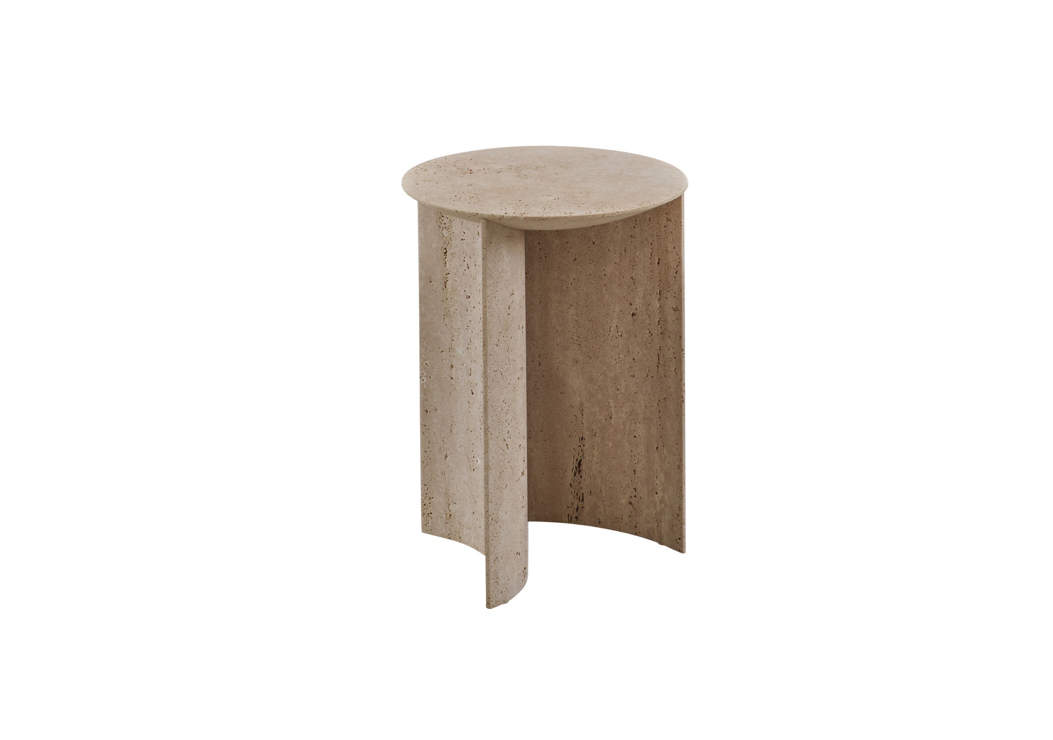 The curved Apuso Occasional Table by Ligne Roset is crafted from natural travertine. Designed by Dozsa & van Dalfsen, it is characterised by its sculptural and organic shape.