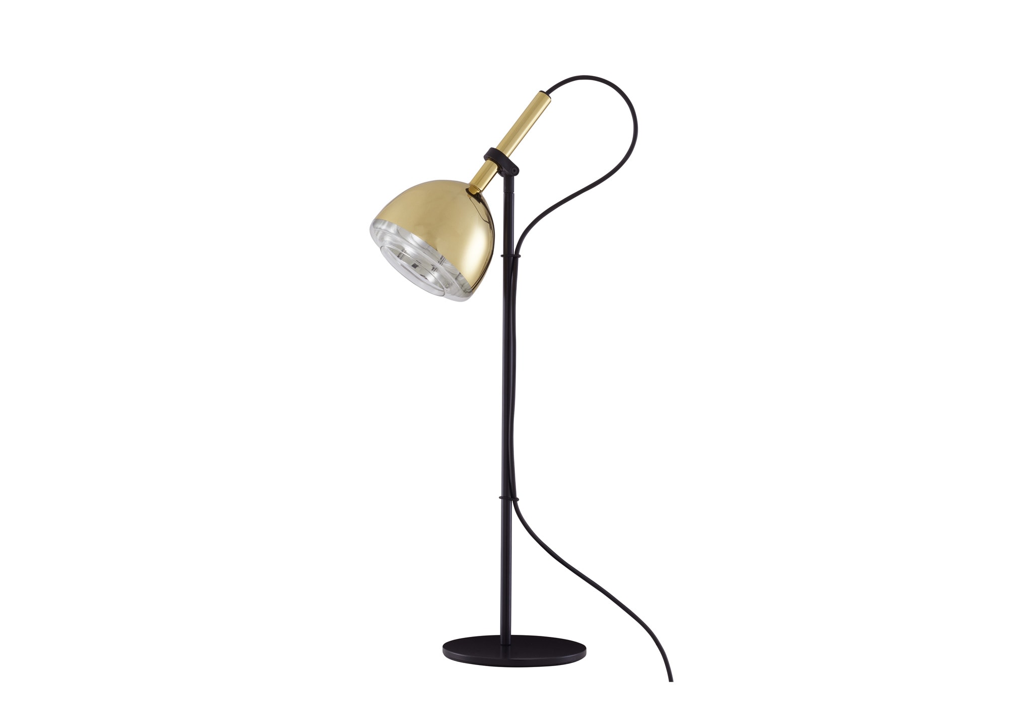 When illuminated, the brass-coated glass becomes transparent, with the bulb becoming visible in a surprising hologram effect. The shade of the reading light is directional (low/high and 360° rotation), enabling one to direct the light source towards the user. Black PVC cable.