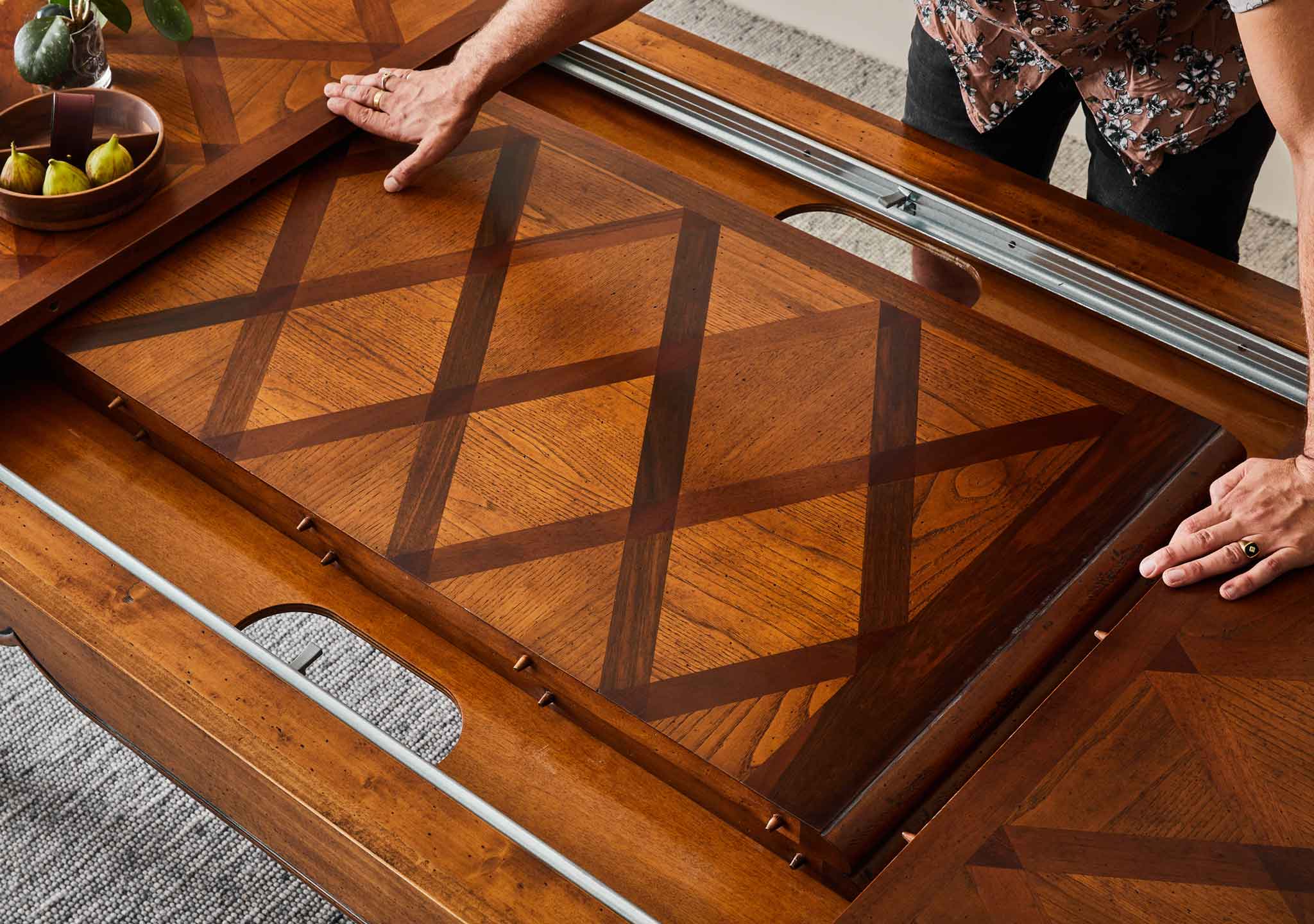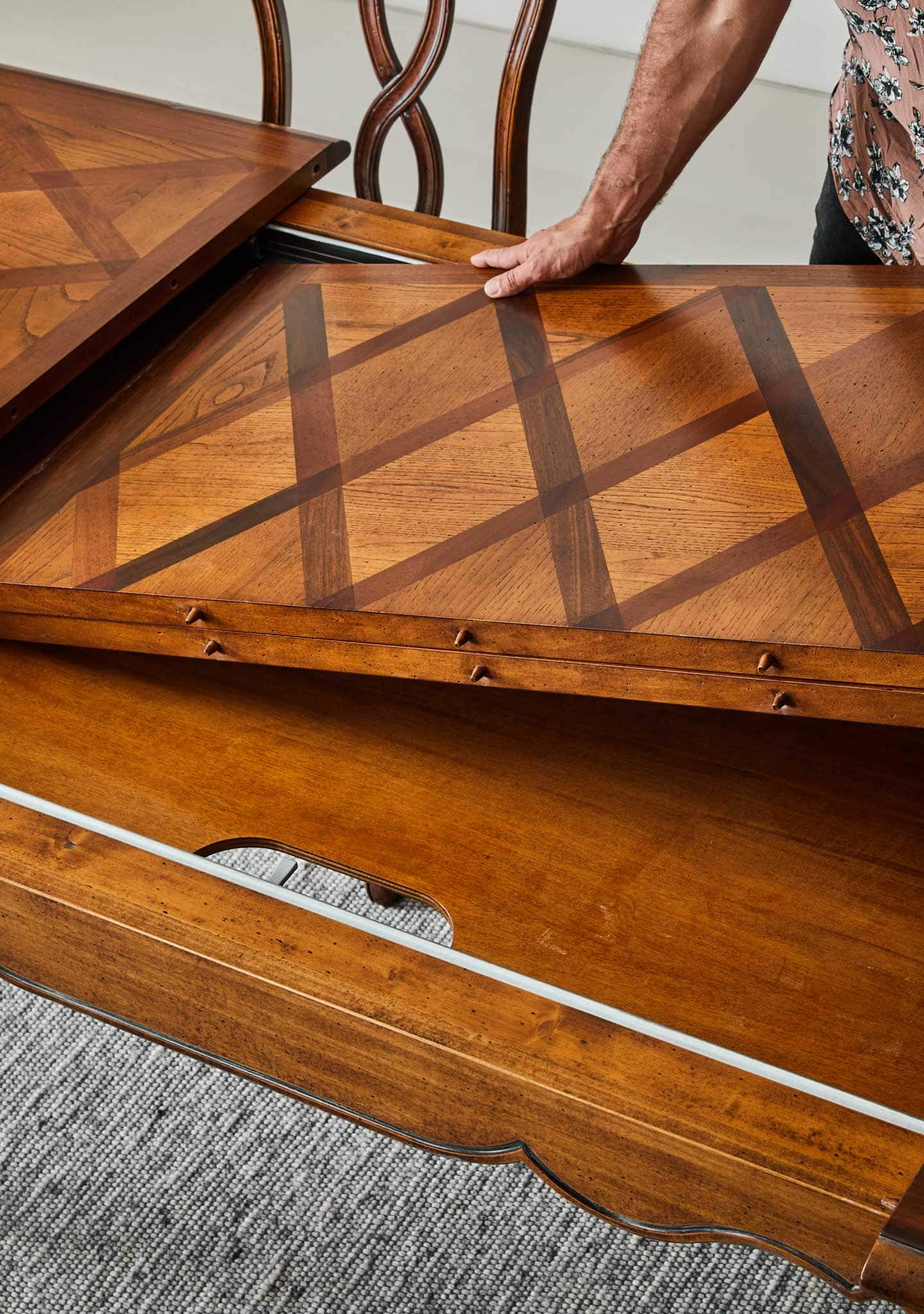 The exquisite Brittany Table plus 2 Extension Leaves is a classic dining table with distinctive timber inlays. Handcrafted in Italy of timber with an intricate inlay design, the table features curve shaped legs.