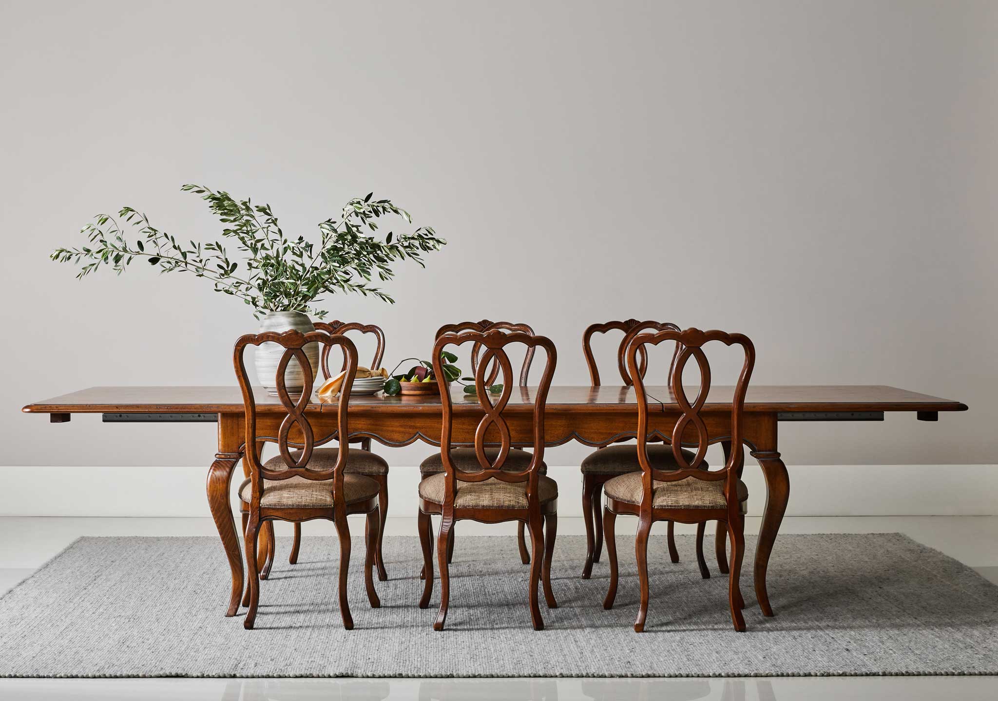 Extension leaves can be added or removed from the centre as desired in order to extend or reduce the length of this statement dining table. The Brittany Table plus 2 Extension Leaves seats 8 people, or can fully extend to accommodate 12 companions.