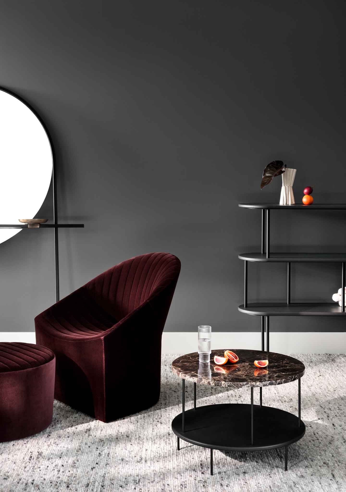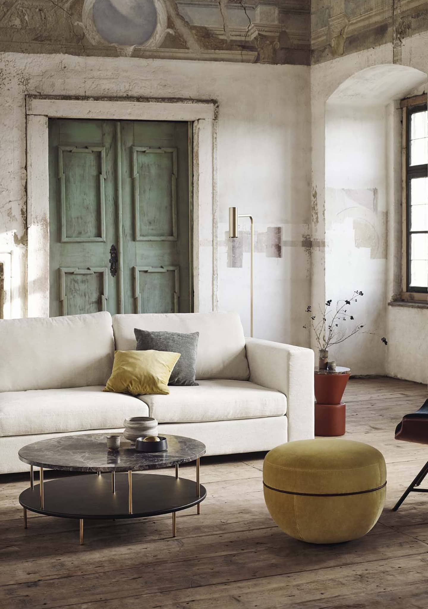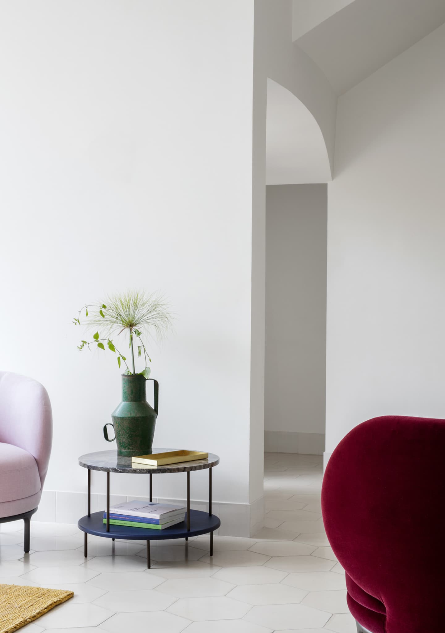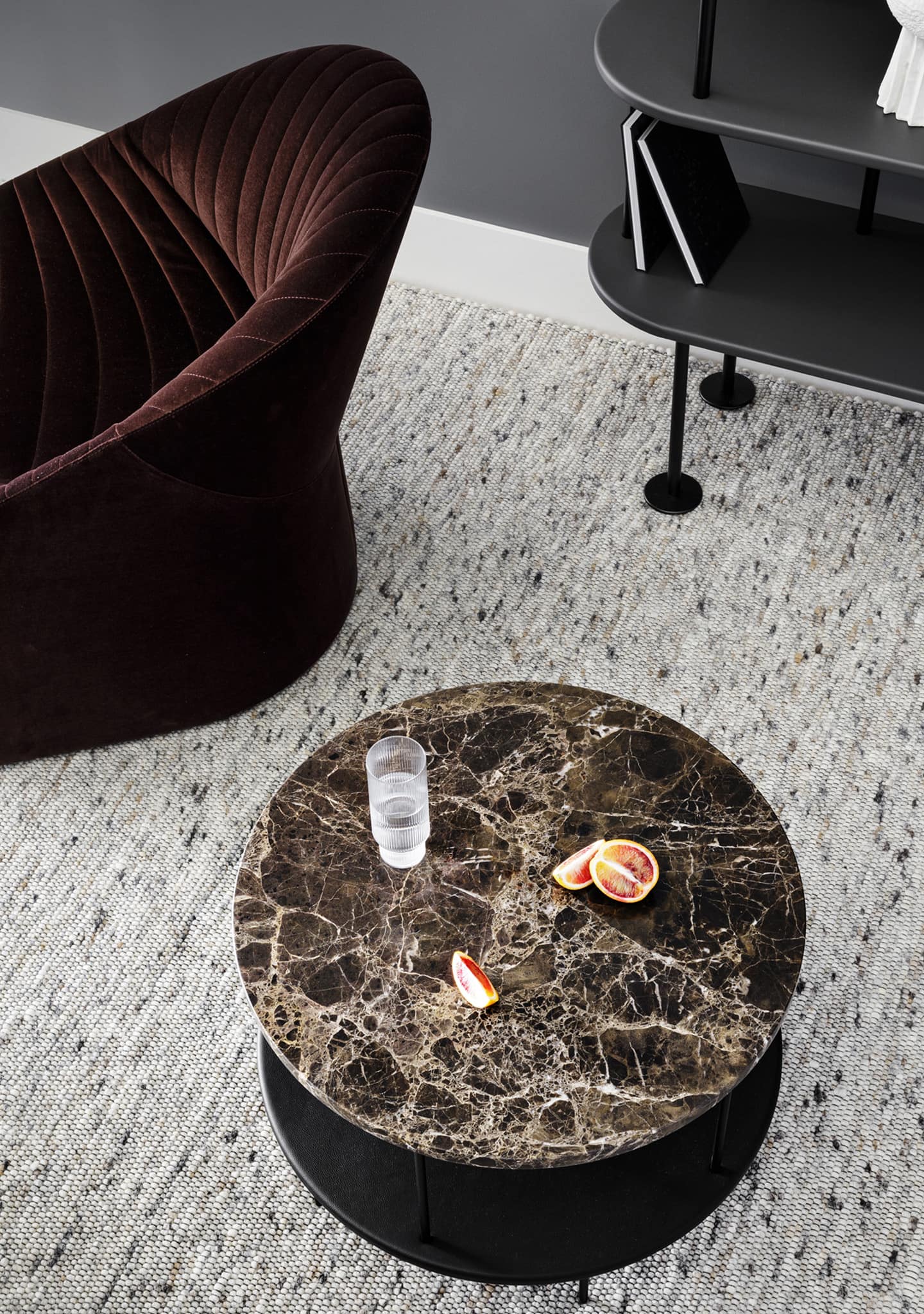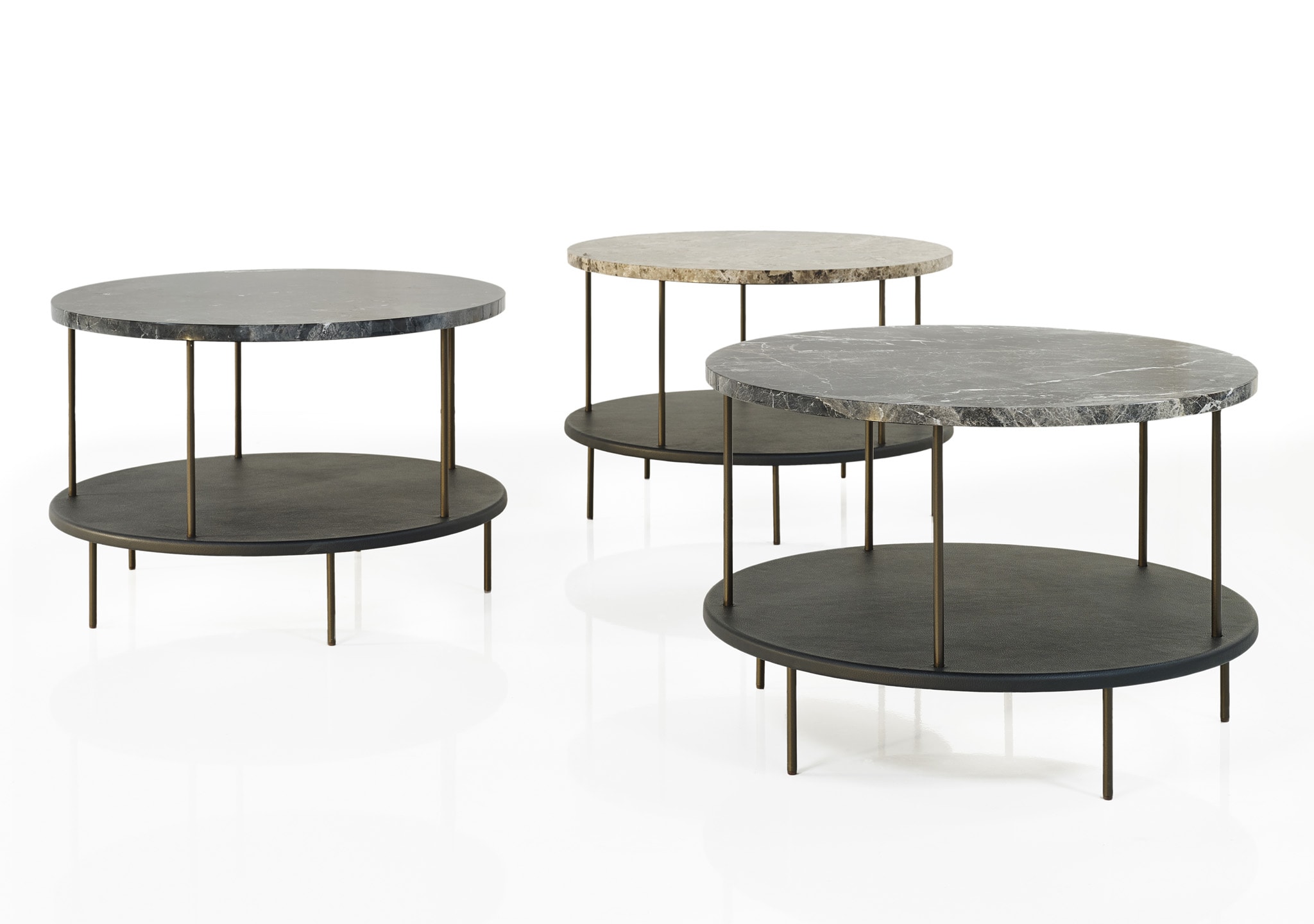 Handcrafted with two table tops – the bottom covered with leather, the top available in marble – the surfaces are connected with strong metal rods made of powder-coated aluminium.