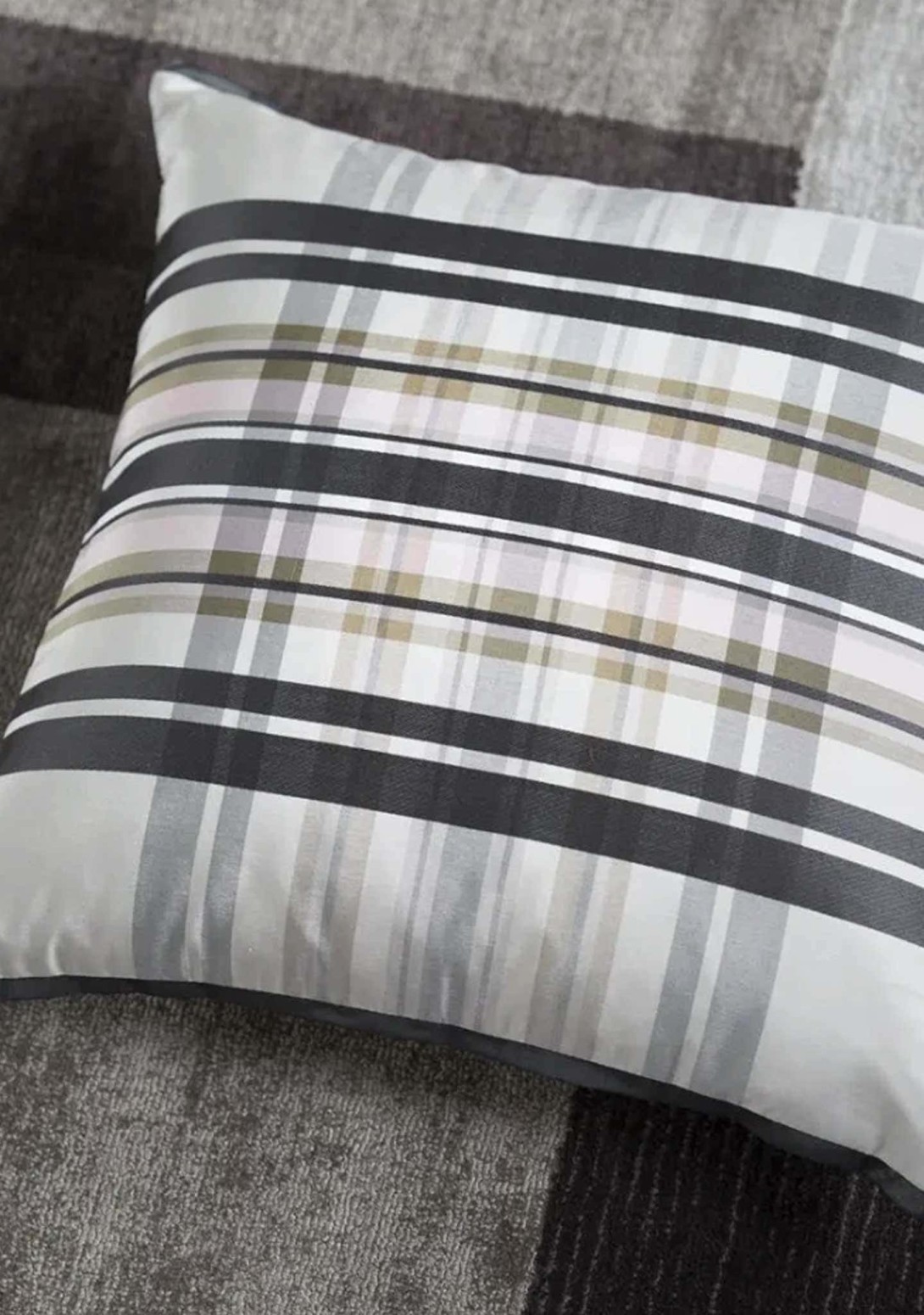 A stunning tartan reversible check cushion is woven in pure silk with satin stripe highlights. In sophisticated neutral with tones of birch cameo and chocolate this luxurious square silk cushion is finished with a Calozzo taffeta trim on two sides.