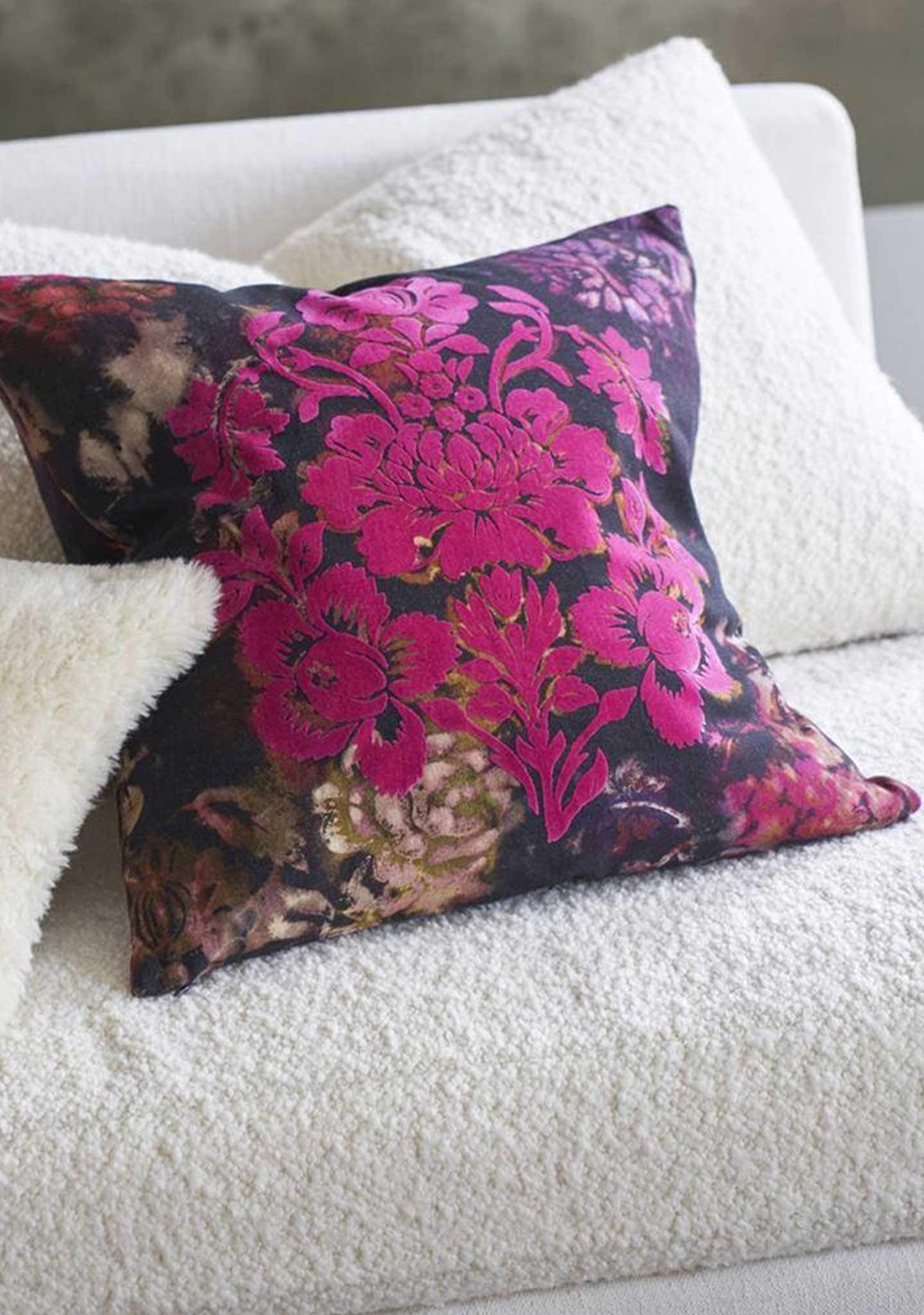 The vibrant Tarbana Amethyst Cushion by Designers Guild celebrates floral damask fragments and leaves.