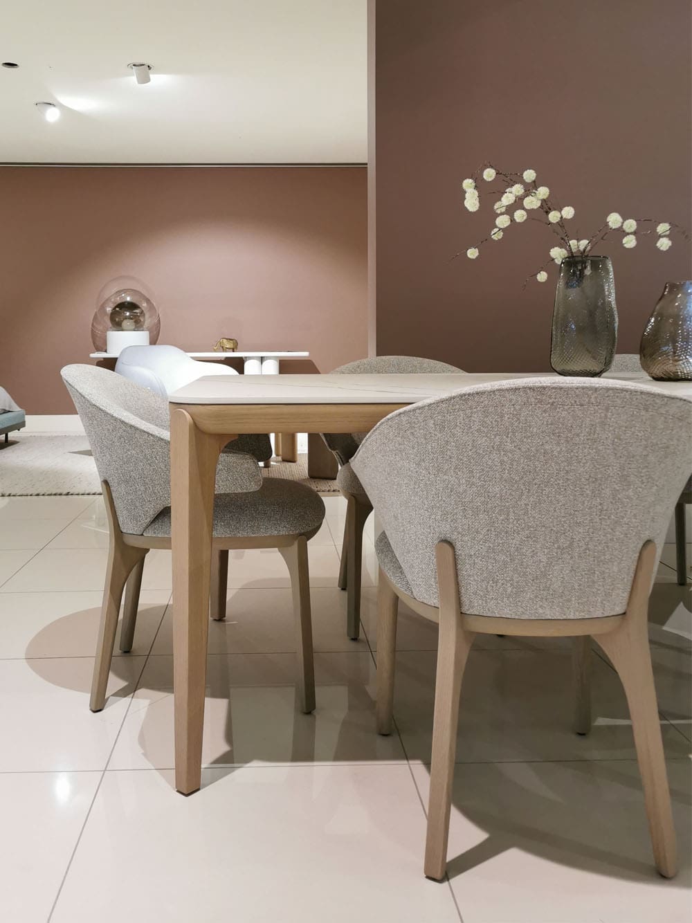 The Erika Dining Armchair by René Chyba for HC28 appears simple with an unruffled gesture. The three dimensional curved lines of the back connect smoothly.