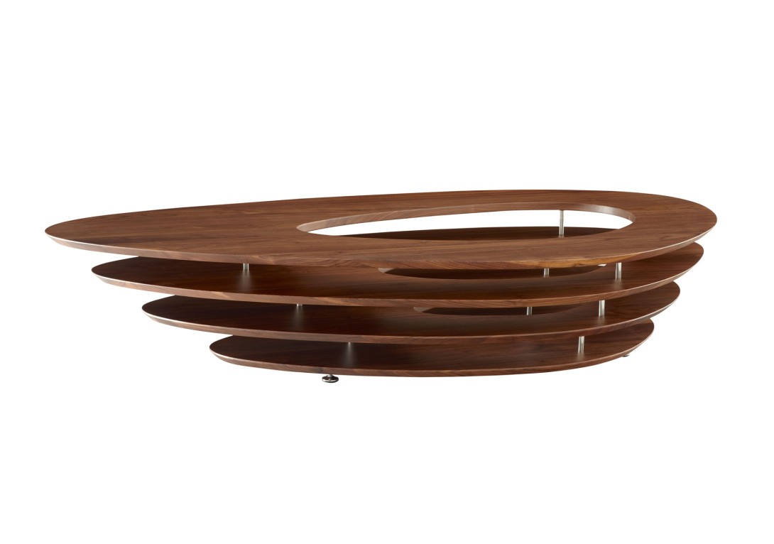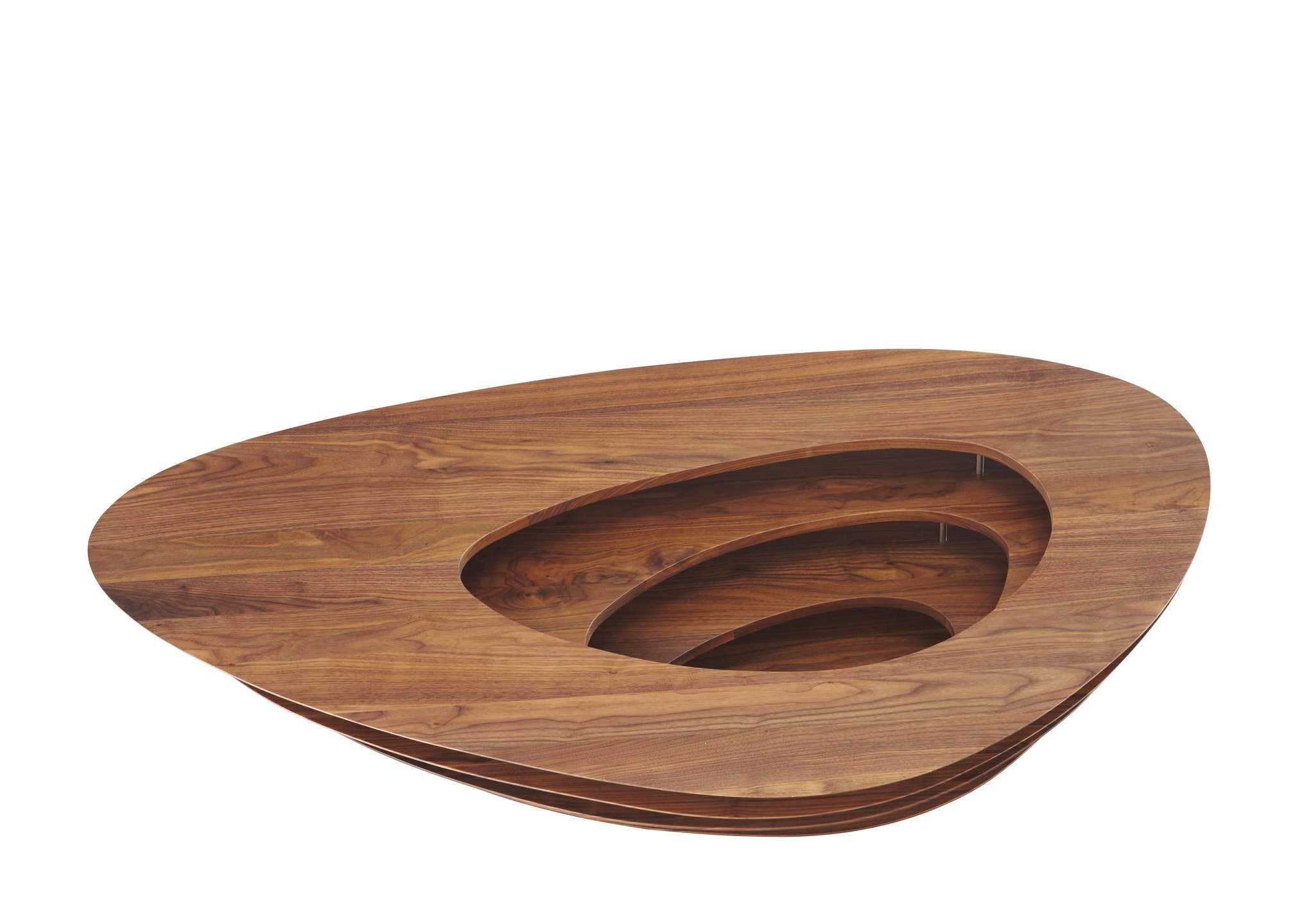 A low table with a boat frame outline, ideal for displaying a key object or slipping in some books. Low table comprising 4 surfaces (in solid walnut or gloss white lacquered MDF) linked to each other by brilliant-chromed steel connector. Made in France