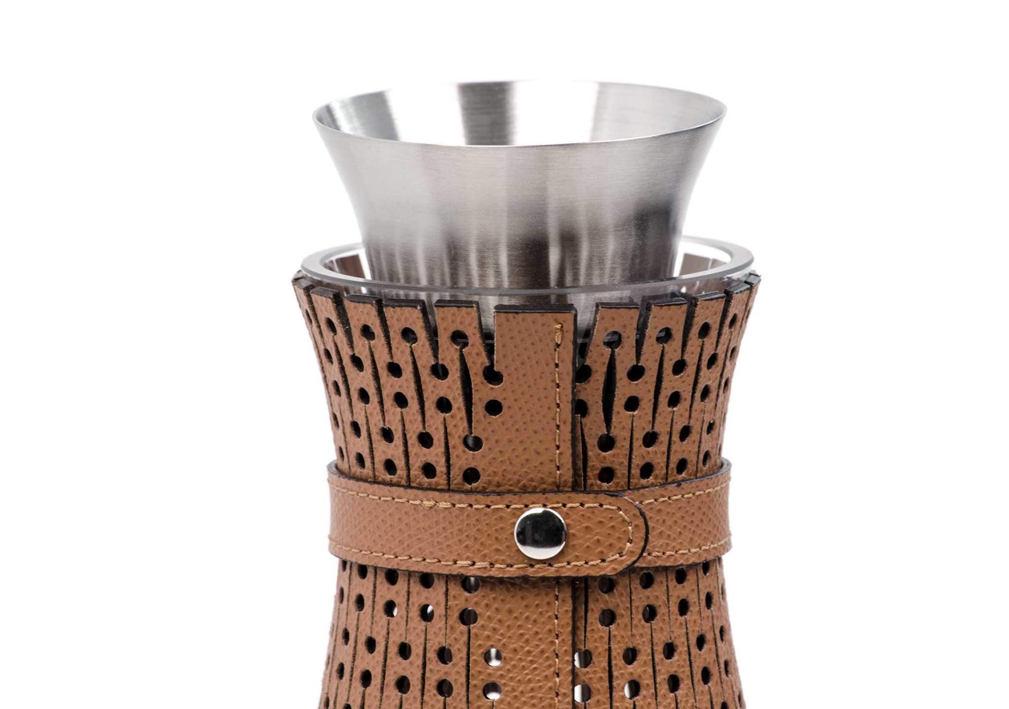 The Karen Carafe with Thermal Base by Pinetti is an ergonomic glass carafe wrapped in leather.