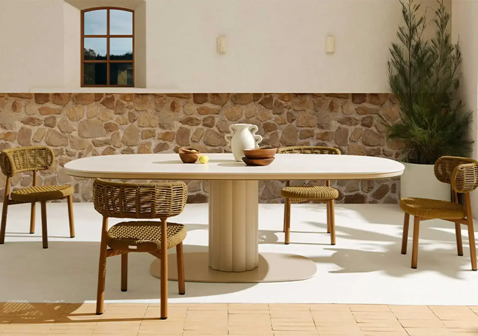 The durable table top is crafted from premium ceramic. While the sturdy aluminium pillar is powder-coated. This sturdy table is built to withstand the elements. Yes, the table is ideal for both indoor dining areas and outdoor patios.