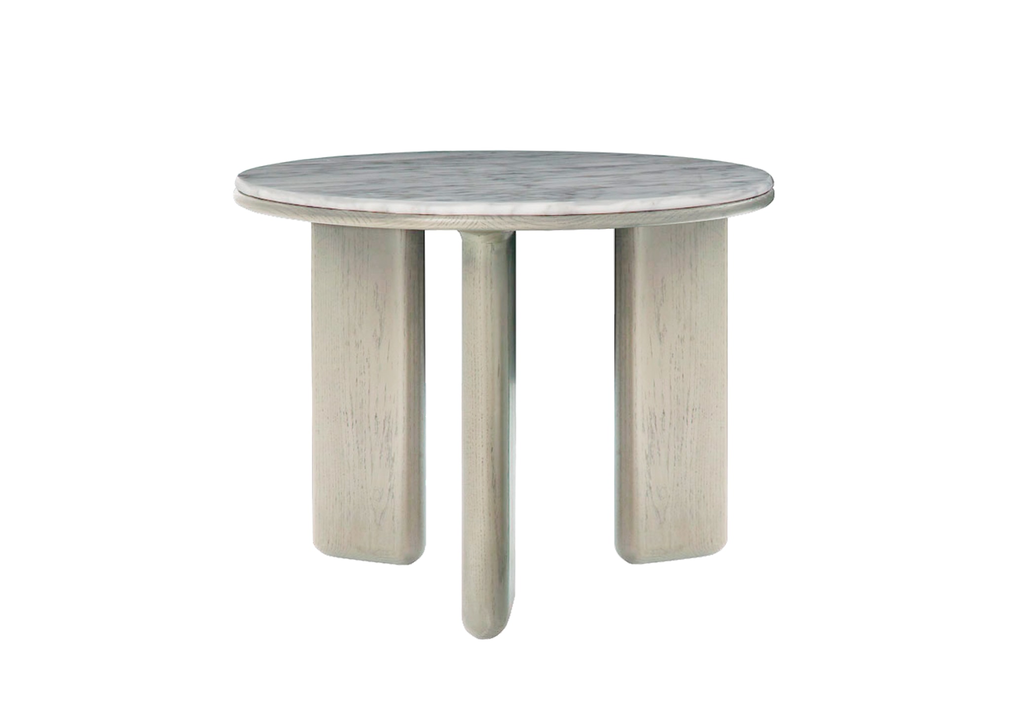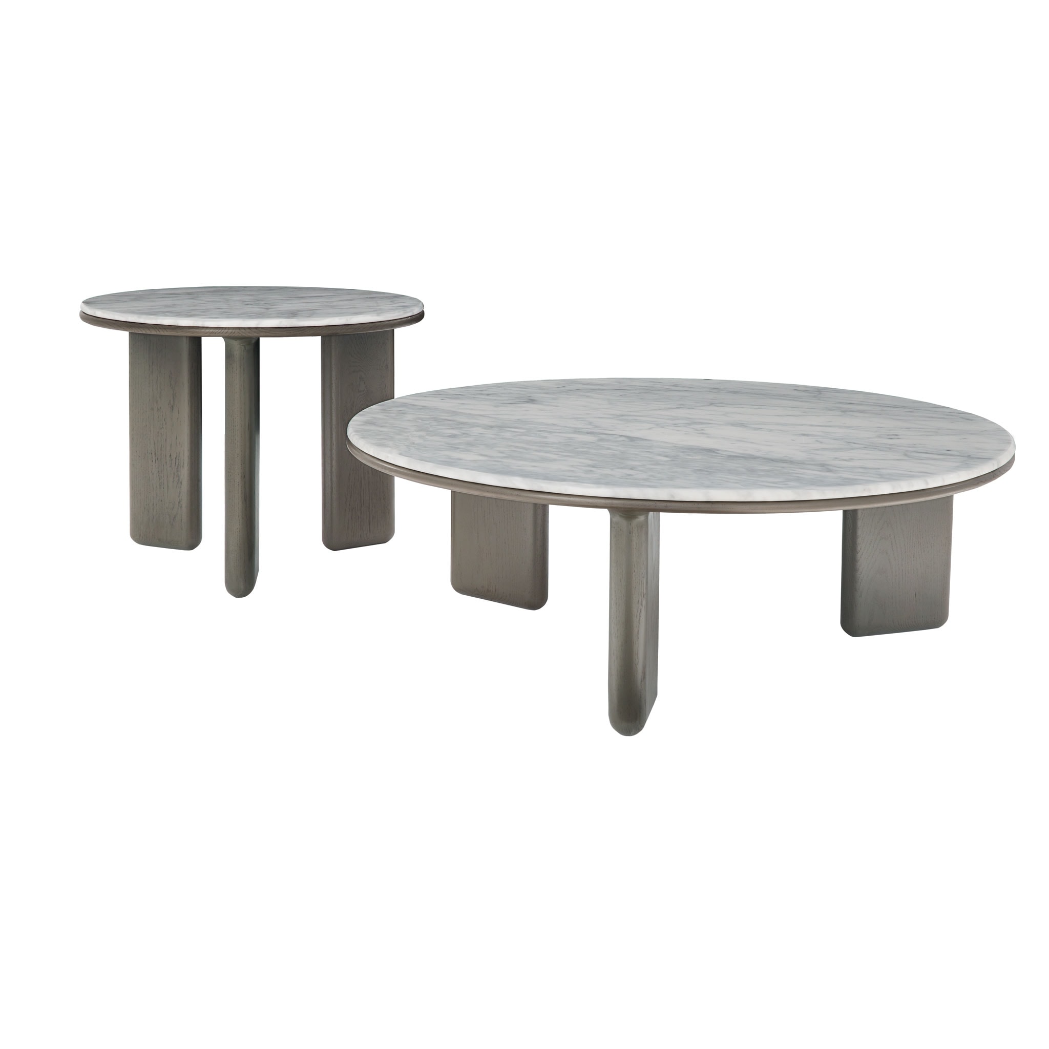 The round coffee table has a table top crafted from natural oak, which may be overlayed with Venato White Marble if desired. Also available is a matching coffee table, which when paired can create a set of nesting occasional tables.