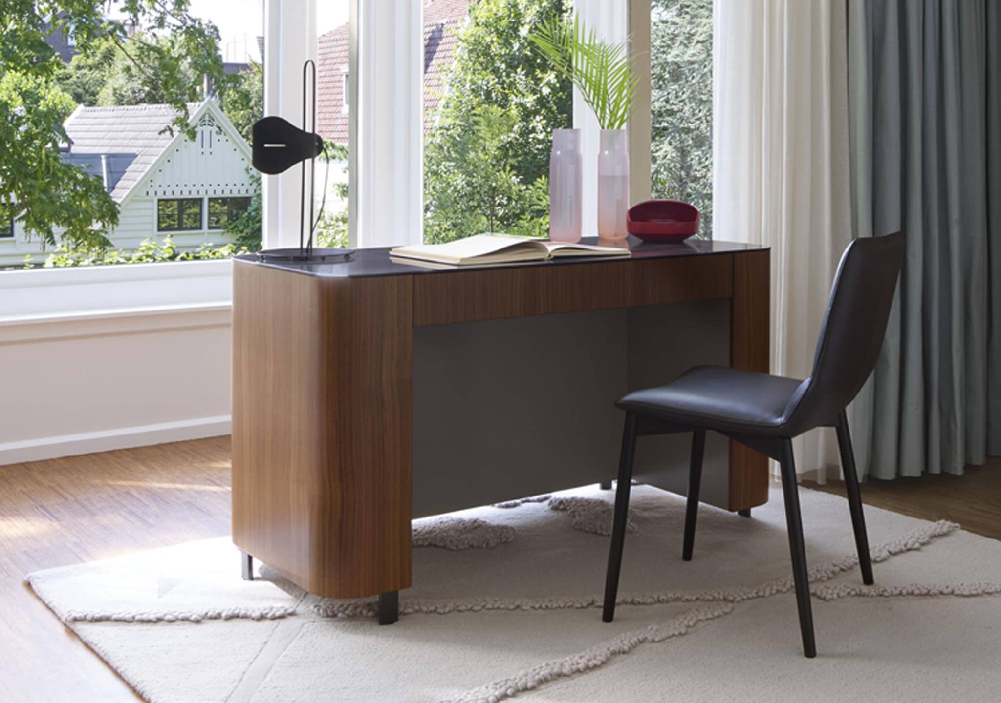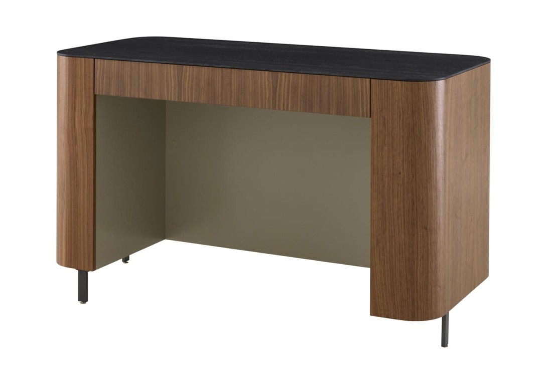 Rounded carcase finished in natural varnished walnut veneer. Front and drawer finished in natural varnished walnut veneer with drawer interior finished in lacquer (argile or plomb). Interior panels and back panel finished in argile or plomb lacquer. Tops in a choice of black marble-effect ceramic stoneware, argile lacquered glass or plomb lacquered glass.