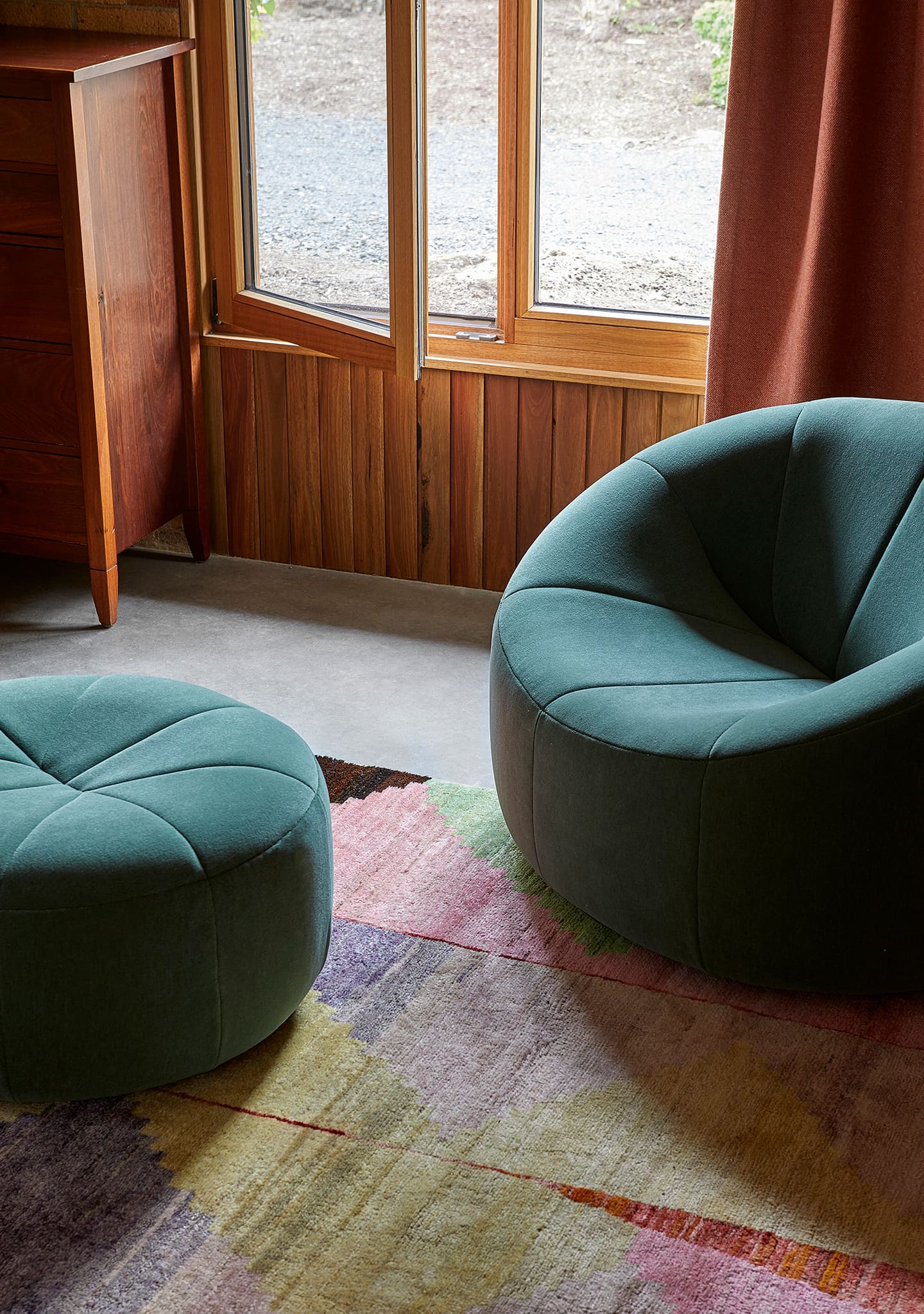 The Pumpkin Footstool is characteristic of Pierre Paulin’s revolutionary design style. As its name suggests, this Ligne Roset stool is evocative of a giant pumpkin, welcoming the user with its protectively voluptuous – and voluptuously protective – shell.