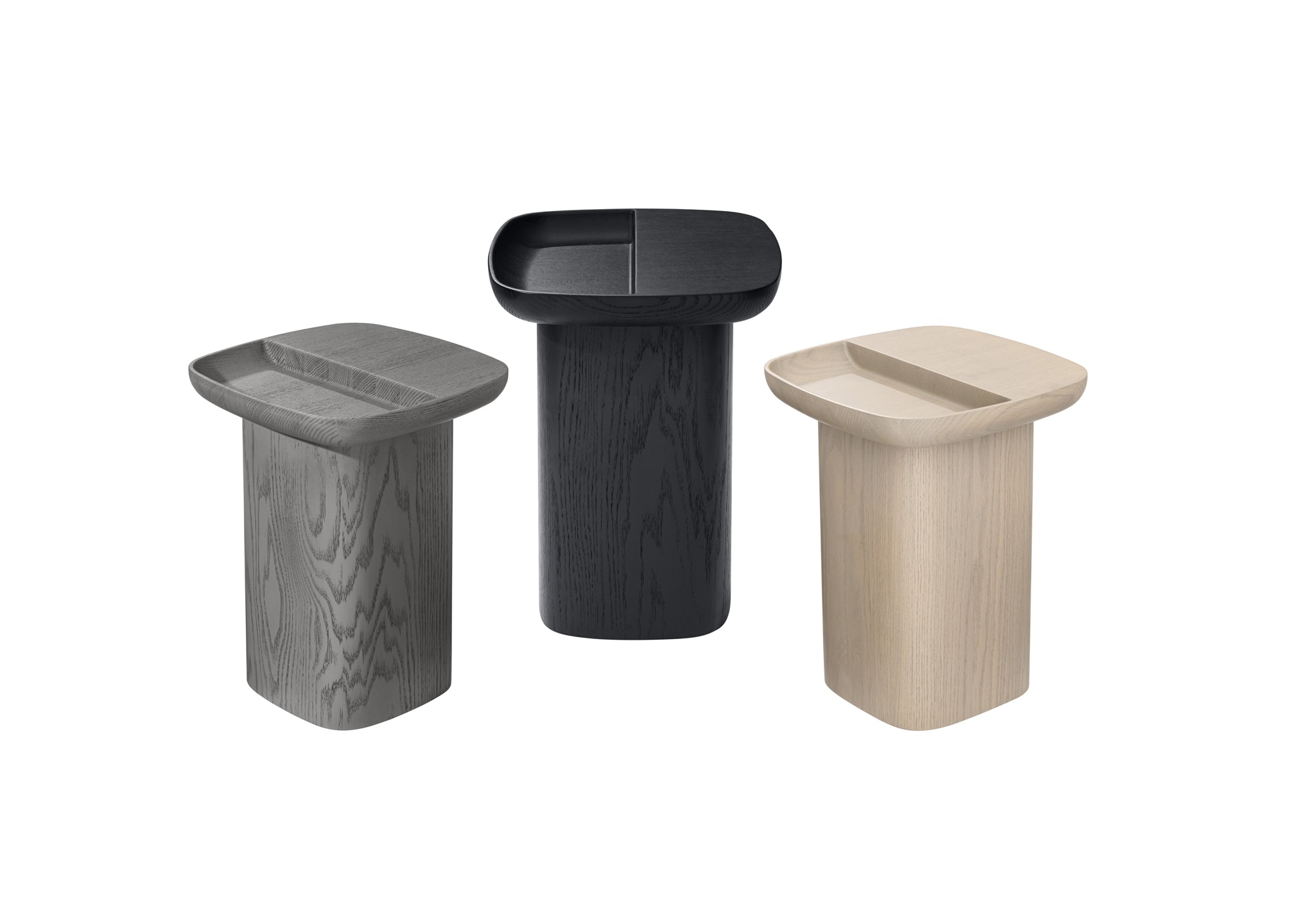 The Stage Side Table reveals the beauty of wood. Sculpture-like lines shape the body and tabletop, half of which is concave in the form of a bowl with smooth curves. Easily paired with a sofa, an armchair or a bed.