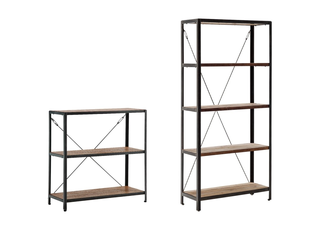 It is available in two styles, one high with 5 shelves and one low with 3 shelves.